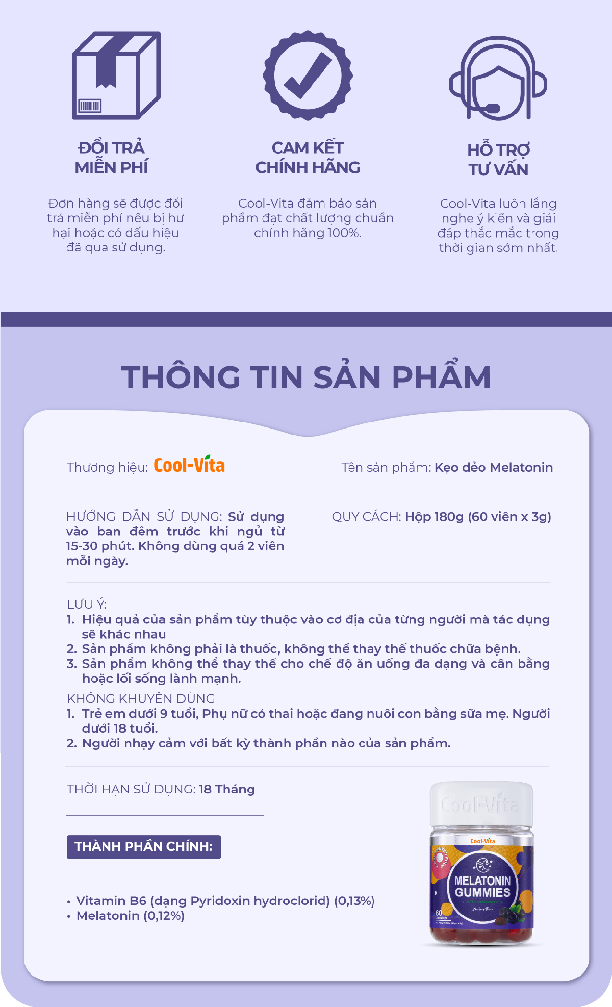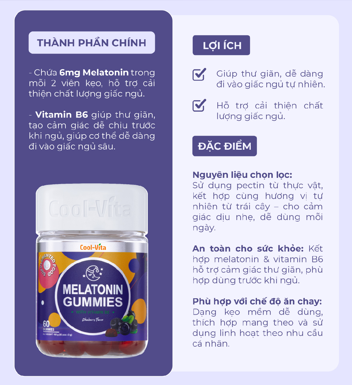 An toàn và lành mạnh: Kẹo Dẻo Melatonin CoolVita không phải là thuốc ngủ, hỗ trợ bạn ngủ ngon hơn.