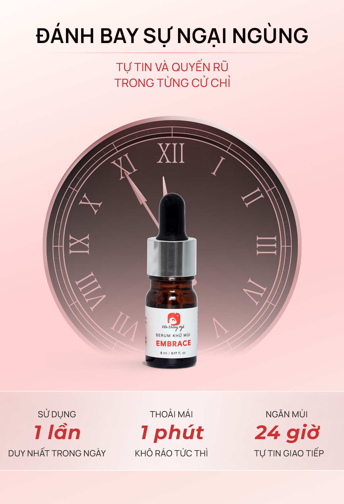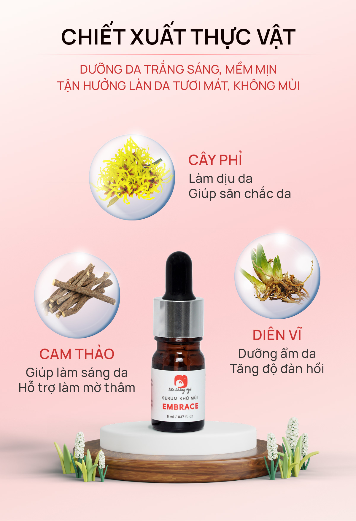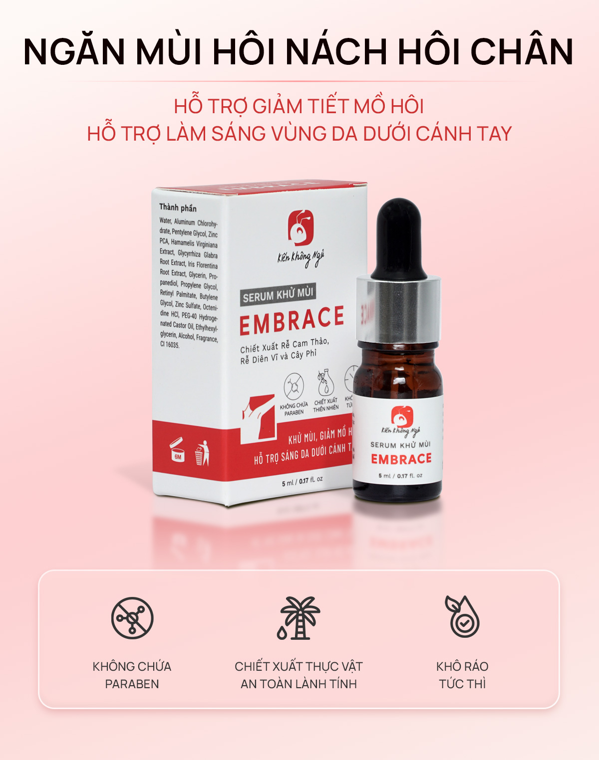 Serum khử mùi EMBRACE với công thức độc quyền chứa các chiết xuất thiên nhiên và Aluminum Chlorohydrate giúp ngăn mùi hôi nách, hôi chân, mang đến hương thơm dễ chịu, duy trì hiệu quả ngăn mùi suốt 24 giờ.