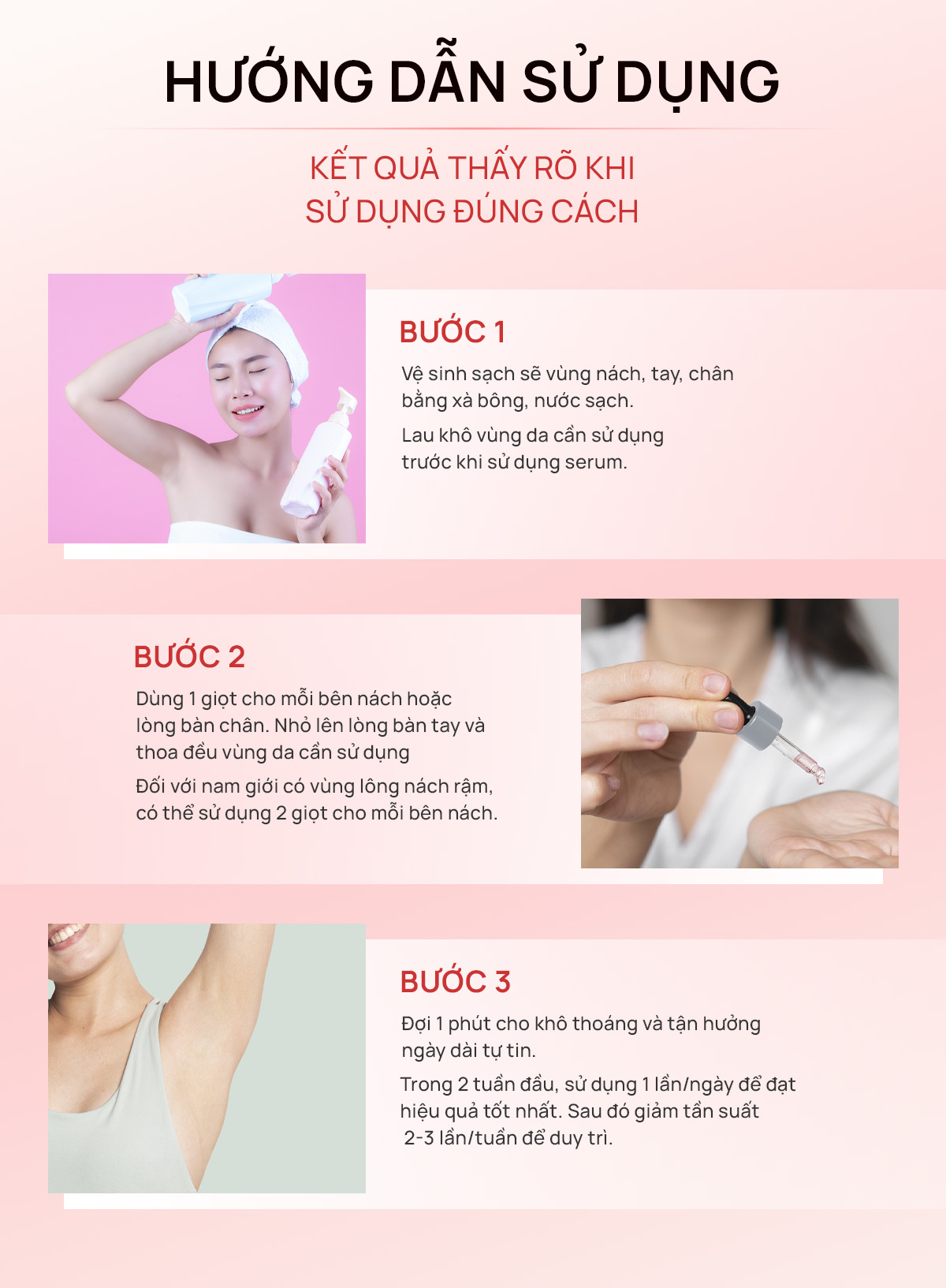 - Vệ sinh sạch sẽ vùng nách, tay, chân bằng xà bông, nước sạch và lau khô trước khi sử dụng serum.