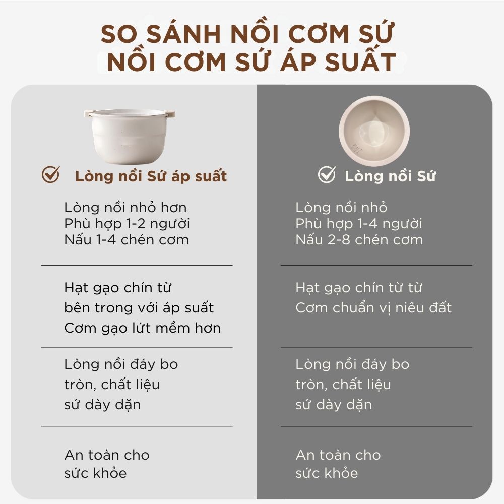 - Lòng sứ dưỡng sinh cao cấp, chống dính tự nhiên trọn đời, không chứa hóa chất độc hại, đảm bảo an toàn tuyệt đối cho sức khỏe người sử dụng.