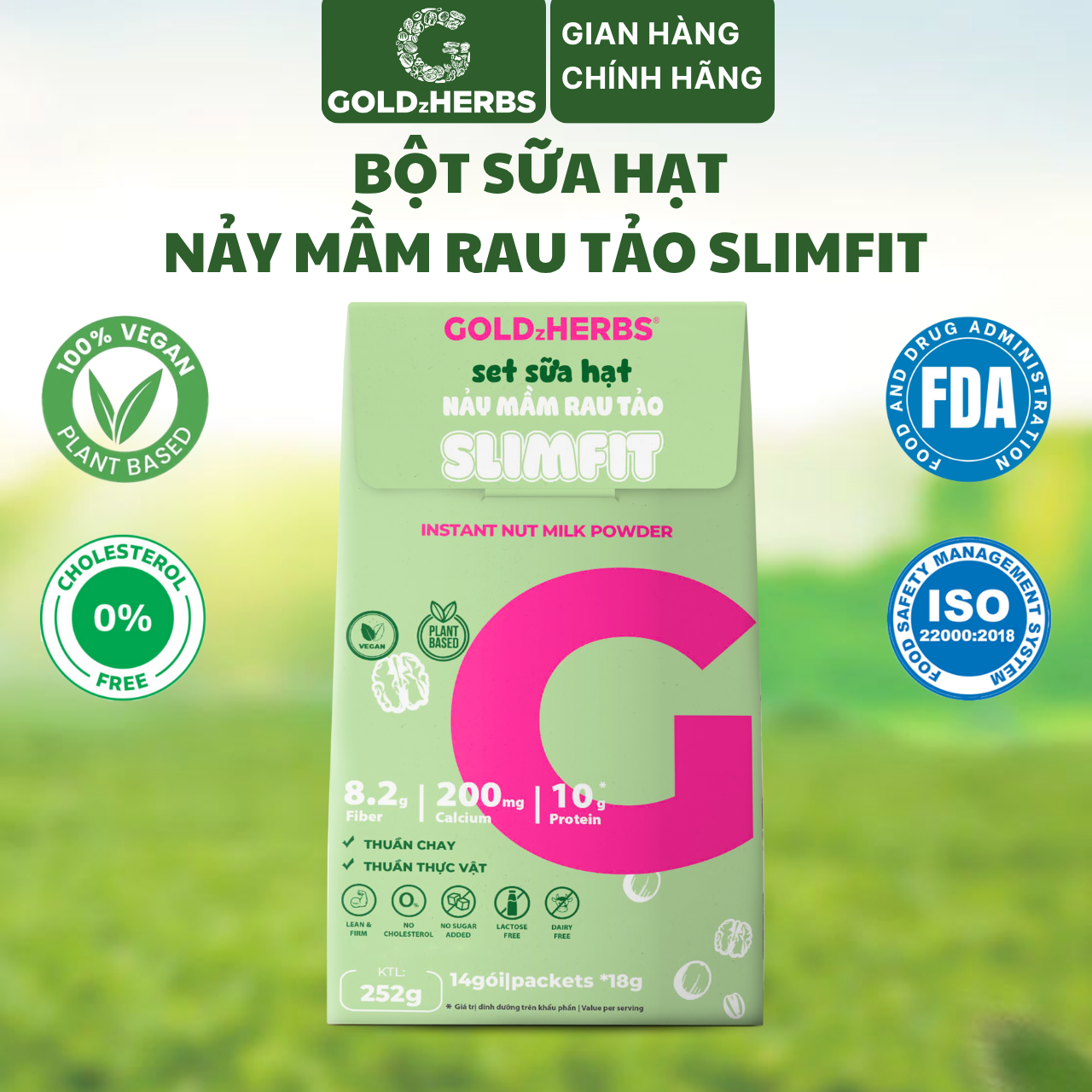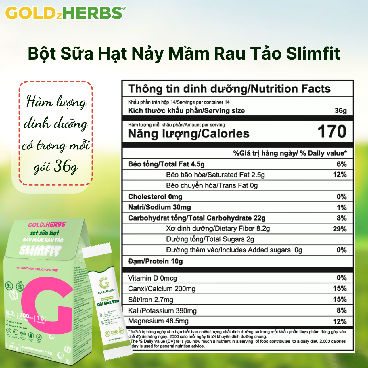 Giới thiệu Hàng chính hãng - Bột sữa hạt nảy mầm rau tảo GoldzHerbs Slimfit - 12 gói/ 252g/ 500g