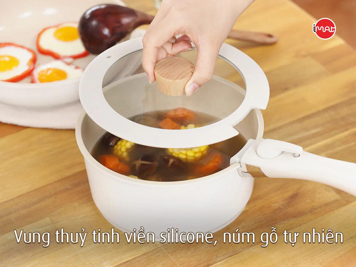 ️ Nắp nồi: Kính cường lực với viền silicone giúp giữ kín hơi, tránh tràn và giữ nguyên hương vị thực phẩm. Núm vung được làm từ gỗ tự nhiên, tạo điểm nhấn tinh tế.