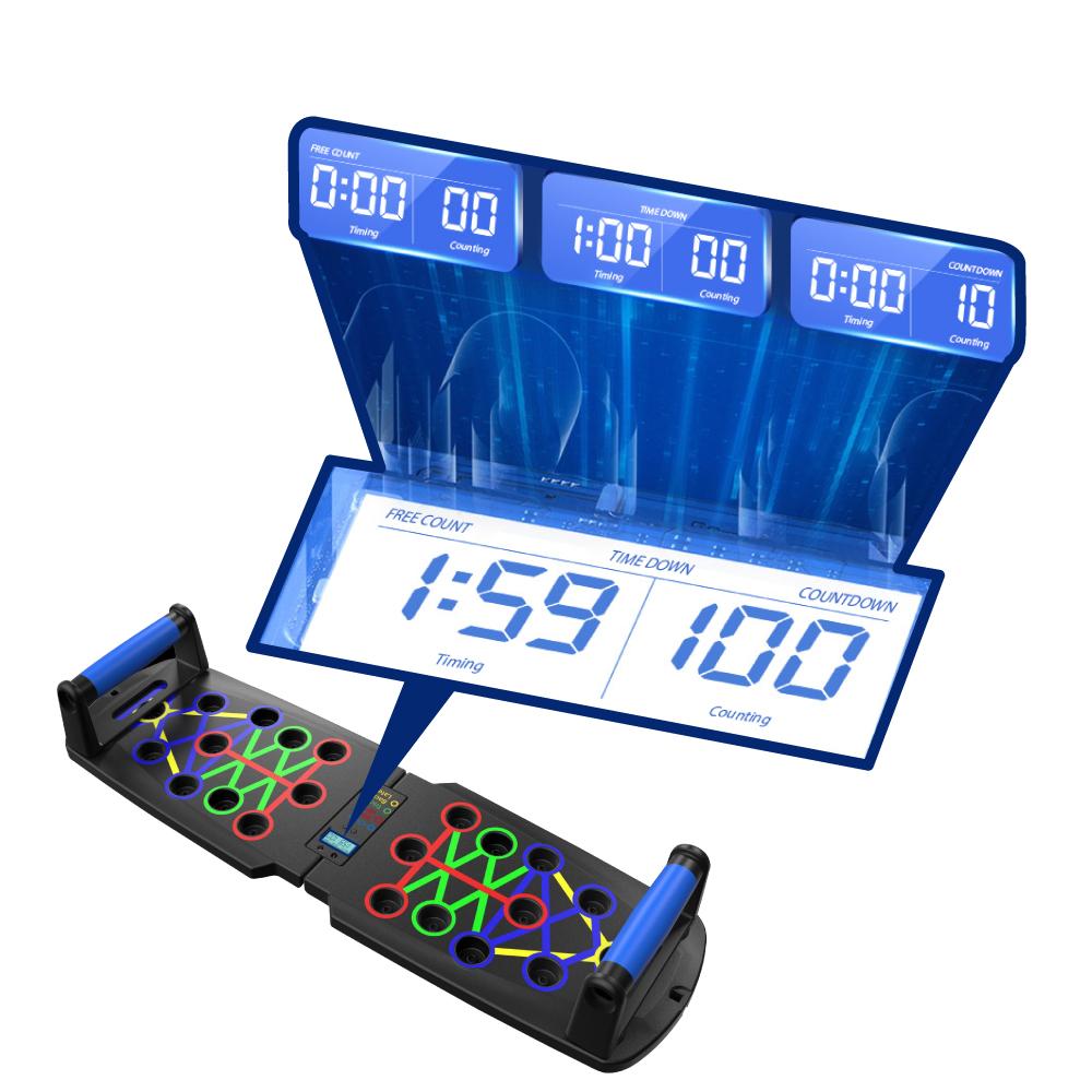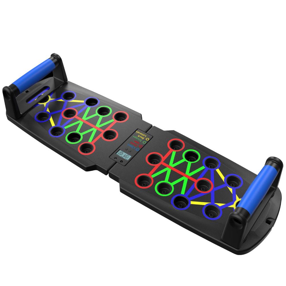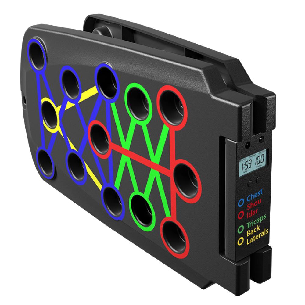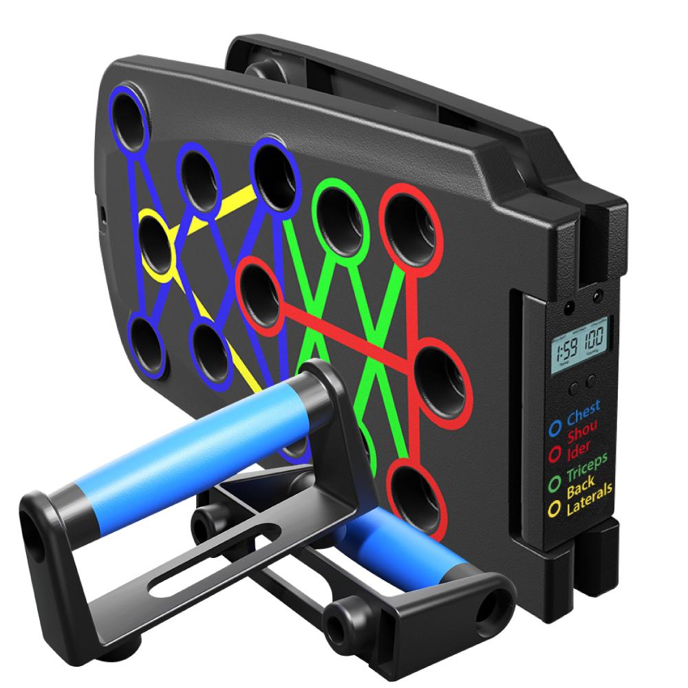 - Dụng cụ chống đẩy mã hóa màu khác nhau nhắm mục đích luyện tập thể dục cơ bắp cụ thể (đỏ cho vai, vàng cho lưng, xanh cho cơ tam đầu).