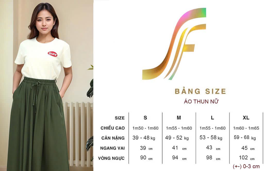 Thiết kế: Áo thun trắng basic với logo Sure Fashion cách điệu in nổi bật ở ngực trái, tạo điểm nhấn tinh tế mà không quá phô trương.