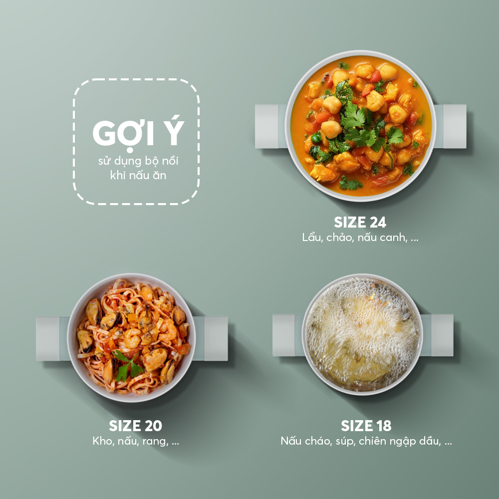 Chinh phục hầu hết tất cả các món từ dễ tới khó: các món kho, hầm, canh ngọt, tới nấu lẩu đậm đà hay các món chiên xào cho bữa cơm gia đình đầy đủ dinh dưỡng, quây quần, đầm ấm. Đặc biệt nồi size 24 đa năng, có thể thay thế nồi lẩu, chảo rán, chảo xào.