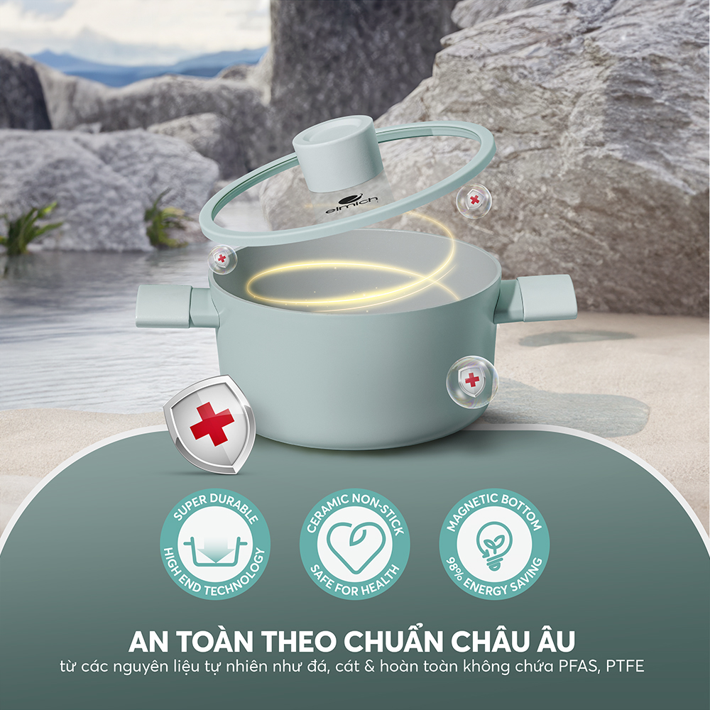 Được làm từ các nguyên liệu tự nhiên như đá, cát và sét thiên nhiên, đảm bảo an toàn tuyệt đối cho sức khỏe cũng như môi trường, hoàn toàn không chứa PFAS và PTFE gây hại.