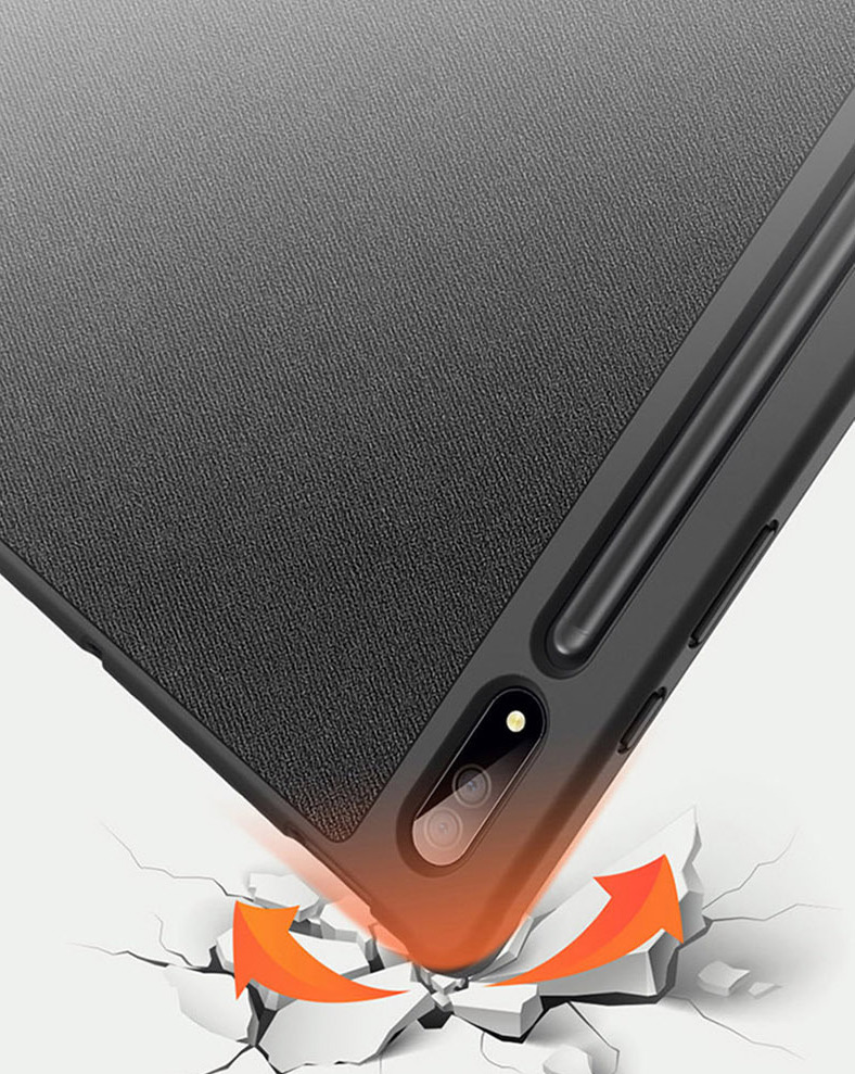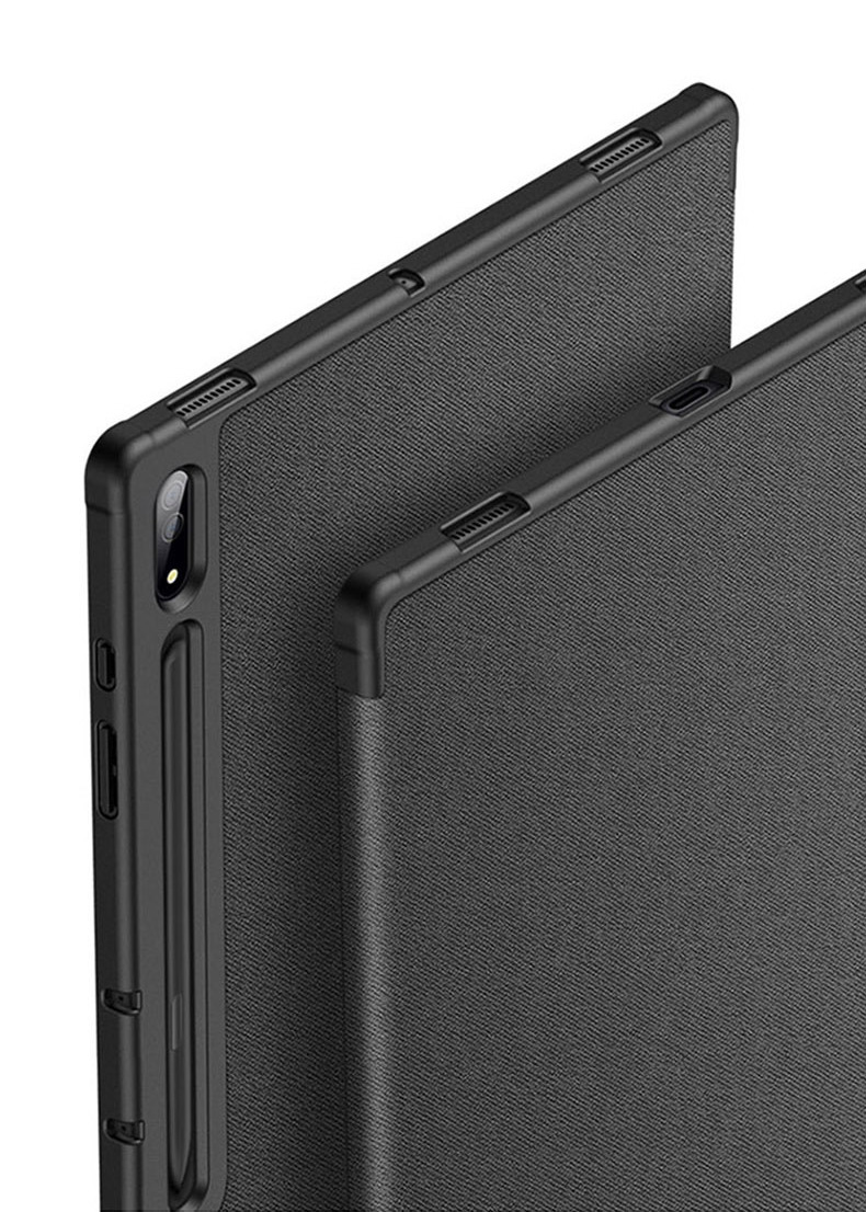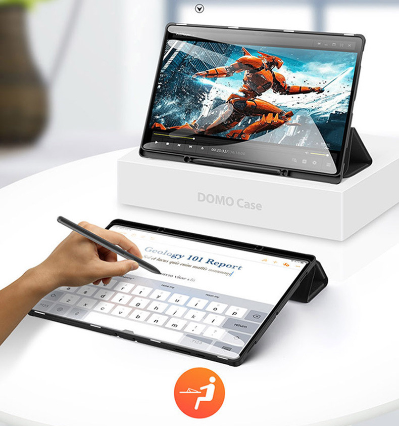 Bao da  chính hãng Dux Ducis Domo có khay đựng bút là thiết kế mới của hãng Dux Ducis với vẻ đẹp thời trang cao cấp cùng tính năng tiện dụng, an toàn bảo vệ toàn diện cho máy. Bao da Dux Ducis Domo Samsung Tab rất đáng sở hữu bởi: Chất liệu nhựa TPU và vải độc đáo, lạ mắt, thân thiện với môi trường. Cảm biến thông minh tự động tắt mở khi đóng mở nắp bao da giúp tiết kiệm pin triệt để.