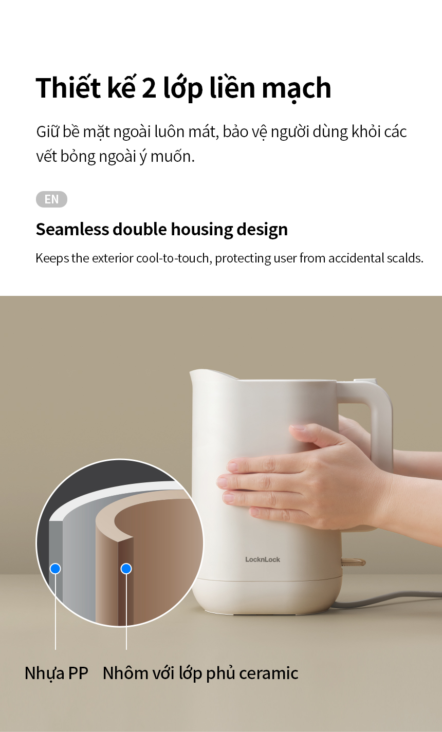 THIẾT KẾ HAI LỚP LIỀN MẠCH: Giữ bề mặt ngoài luôn mát, bảo vệ người dùng khỏi các vết bỏng ngoài ý muốn