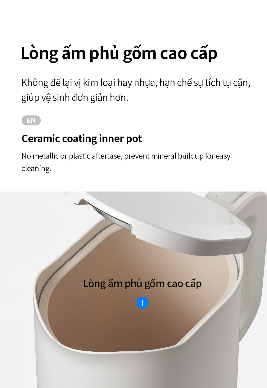 LÒNG ẤM PHỦ GỐM CAO CẤP: Không để lại vị kim loại hay nhựa, hạn chế sự tích tụ cặn, giúp vệ sinh đơn giản hơn
