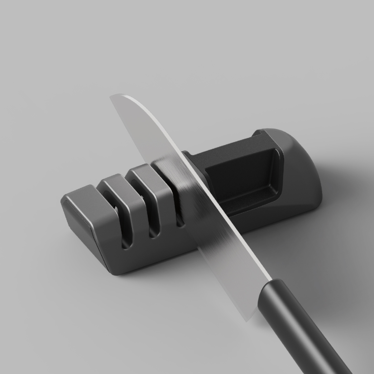 Đặt dụng cụ mài dao trên một mặt phẳng, giữ dụng cụ bằng một tay và cầm cán dao bằng tay còn lại