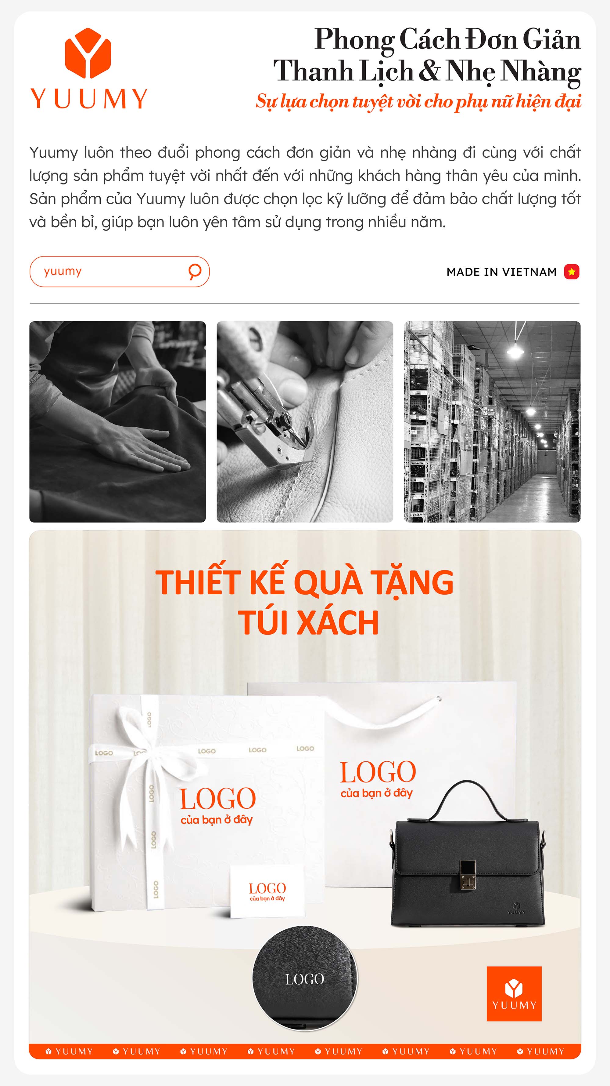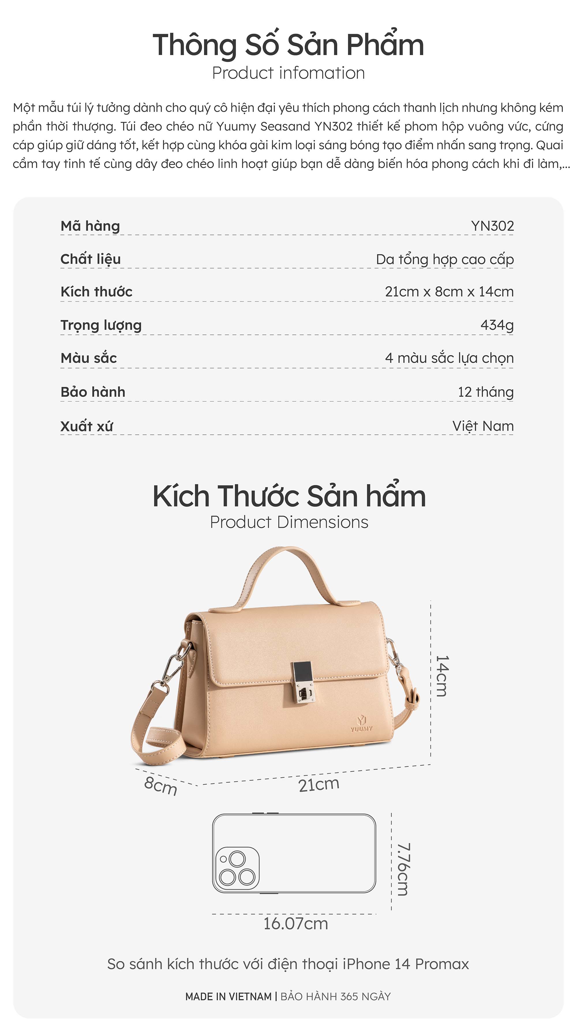 Một mẫu túi lý tưởng dành cho quý cô hiện đại yêu thích phong cách thanh lịch nhưng không kém phần thời thượng. Túi đeo chéo nữ Yuumy Seasand YN302 thiết kế phom hộp vuông vức, cứng cáp giúp giữ dáng tốt, kết hợp cùng khóa gài kim loại sáng bóng tạo điểm nhấn sang trọng. Quai cầm tay tinh tế cùng dây đeo chéo linh hoạt giúp bạn dễ dàng biến hóa phong cách khi đi làm, dự tiệc hay gặp gỡ bạn bè. Chất liệu da tổng hợp cao cấp, bề mặt mịn màng, dễ lau chùi. Túi có nhiều màu sắc trung tính nhẹ nhàng, dễ dàng phối với mọi outfit trong tủ đồ của bạn.