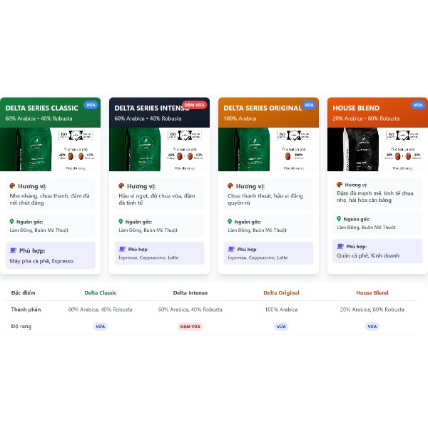 Cà Phê Hạt Nguyên Chất Perfetto Delta Series & House Blend 1000g (Classic / Intenso / Original / House Blend)