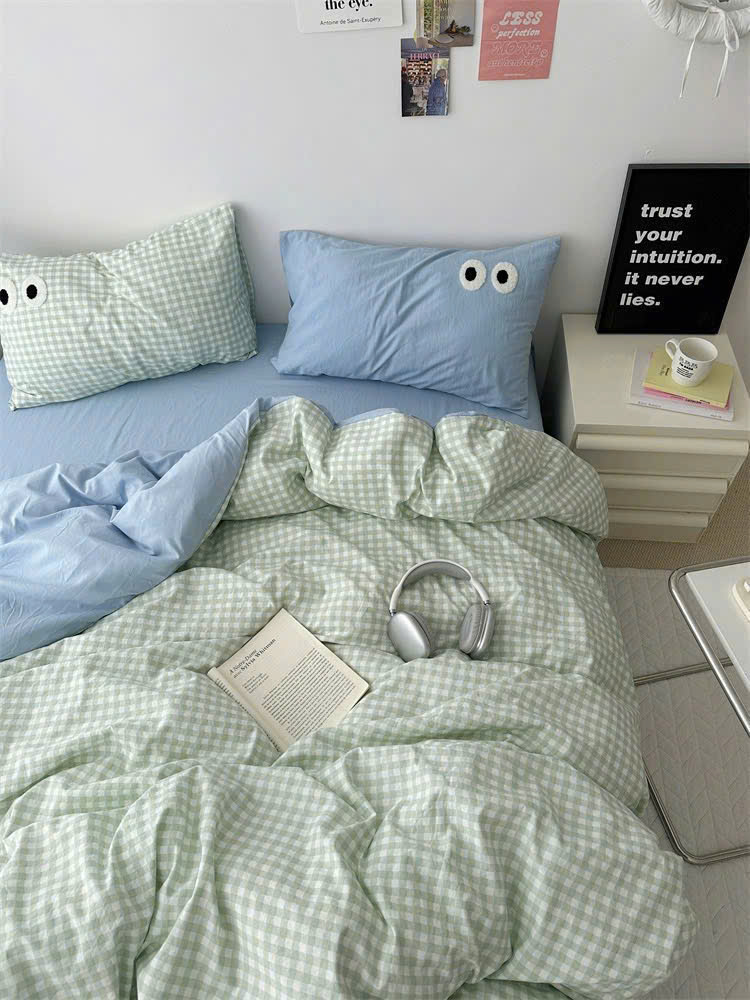 Bộ vỏ chăn ga gối cotton tici LIDACO họa tiết kẻ đôi mắt hiện đại bo chun đủ mọi cỡ nệm
