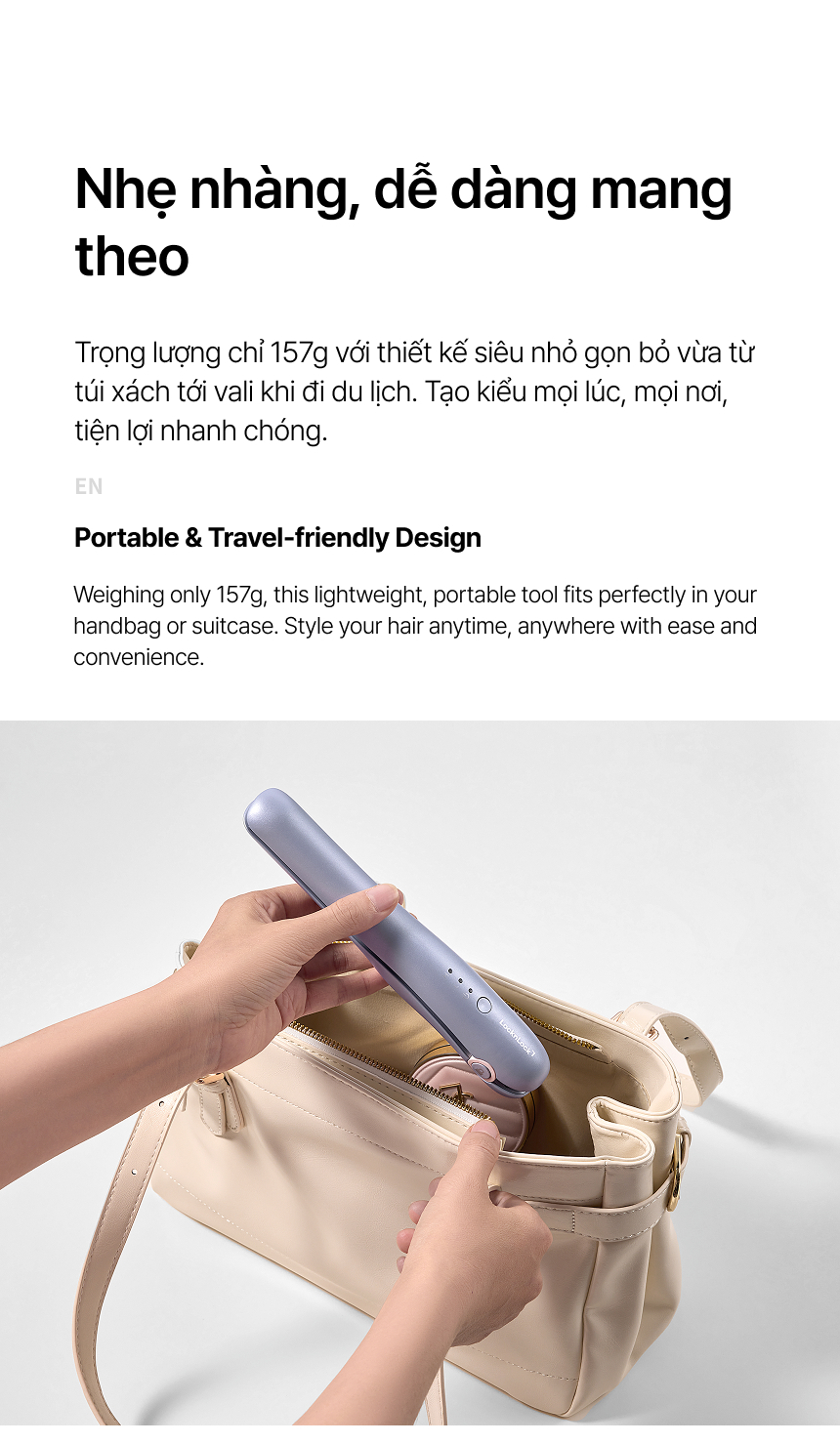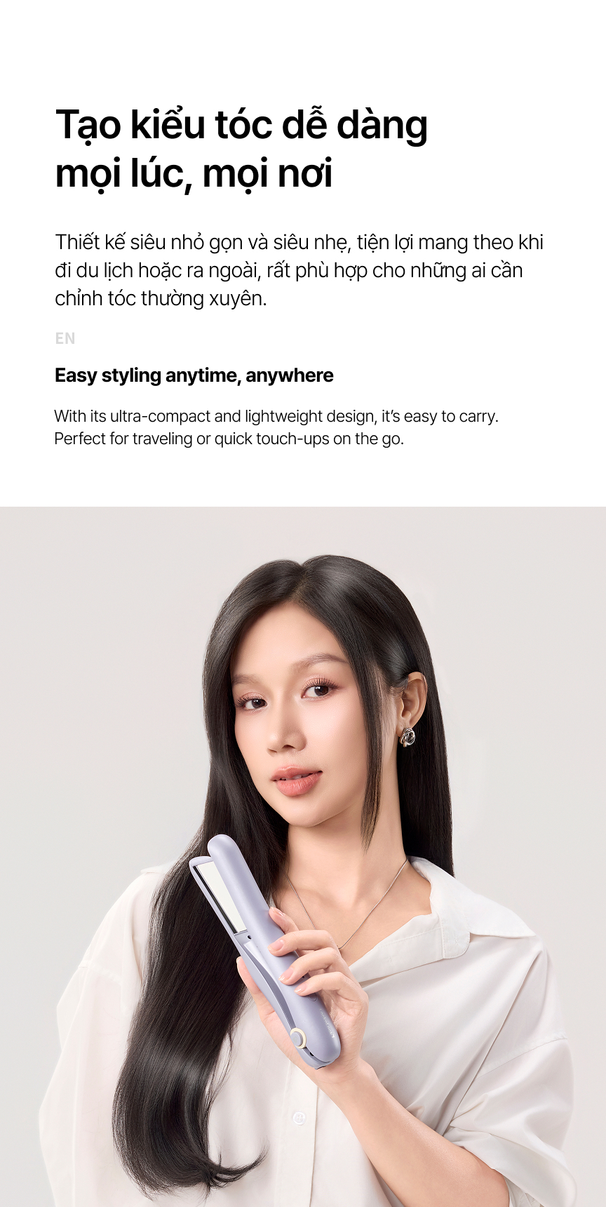- THIẾT KẾ NHỎ GỌN & DỄ DÀNG MANG THEO: Sở hữu trọng lượng chỉ 157g cùng thiết kế siêu nhỏ gọn, thiết bị mang đến sự tiện lợi tối đa cho mọi hành trình, dễ dàng bỏ vào túi xách hoặc túi du lịch. Cho phép bạn tạo kiểu nhanh chóng mọi lúc, mọi nơi – dù ở nhà, tại văn phòng hay khi đang di chuyển