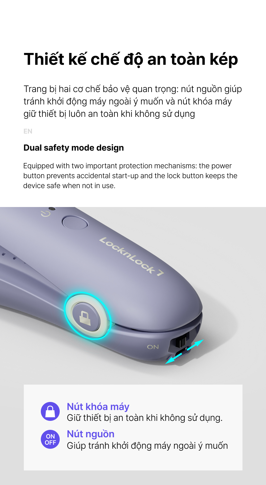 - CHẾ ĐỘ AN TOÀN KÉP: Trang bị hai cơ chế bảo vệ quan trọng: nút nguồn giúp tránh khởi động máy ngoài ý muốn và nút khóa máy giúp giữ thiết bị luôn an toàn khi không sử dụng.