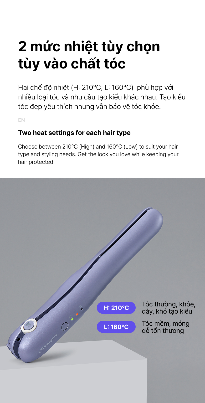 - 2 MỨC NHIỆT ĐỘ: Hai chế độ nhiệt (H: 210oC, L: 160oC) phù hợp với nhiều loại tóc và nhu cầu tạo kiểu khác nhau. Dù bạn sở hữu mái tóc mỏng, yếu hay dày và xoăn, bạn đều có thể chọn mức nhiệt phù hợp để đạt được kiểu tóc mong muốn một cách an toàn.