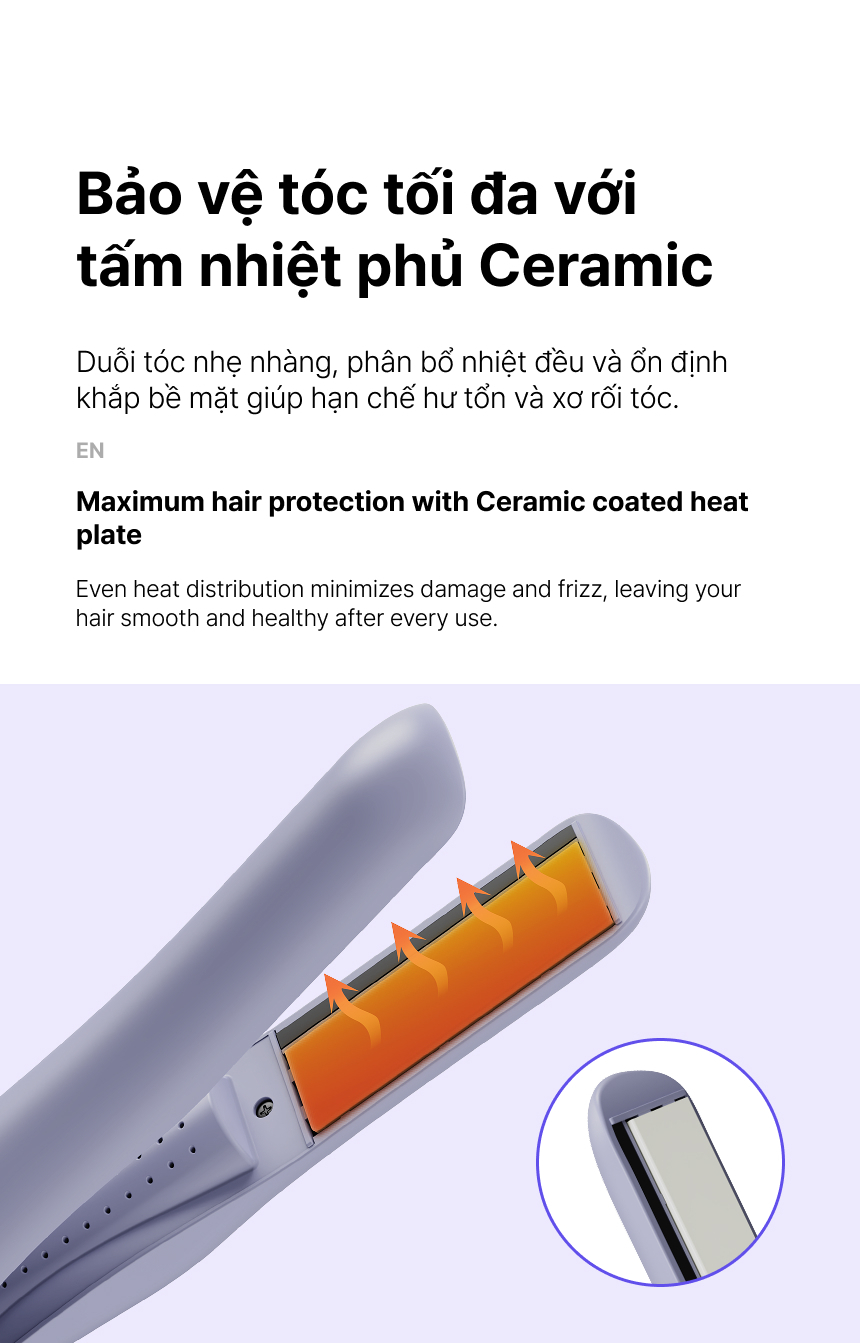 - TẤM NHIỆT PHỦ CERAMIC: Trượt nhẹ nhàng qua tóc, phân bổ nhiệt đều và ổn định trên toàn bộ bề mặt, giúp hạn chế tối đa hư tổn và xơ rối cho mái tóc.