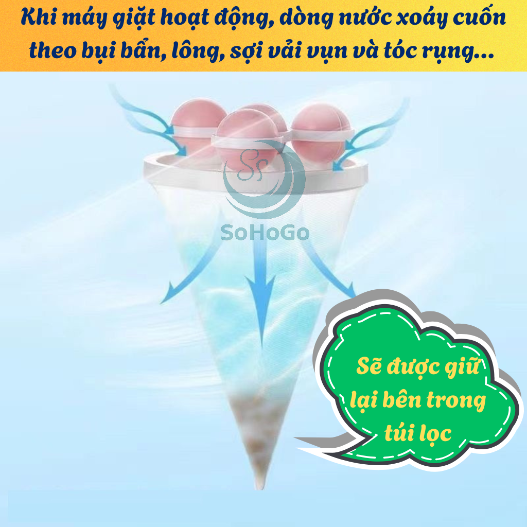 Túi lọc rác máy giặt được thiết kế thông minh với dạng phễu và khung nhựa tròn chắc chắn, đi kèm 4 quả bóng nổi giúp túi luôn giữ thăng bằng trên mặt nước. Khi máy giặt hoạt động, dòng nước xoáy cuốn theo bụi bẩn, lông, sợi vải vụn và tóc rụng… sẽ được giữ lại bên trong túi lọc. Nhờ vậy, quần áo sạch hơn, không còn bám lông hay bụi vải, đồng thời giảm tình trạng tắc nghẽn đường ống thoát nước của máy giặt.