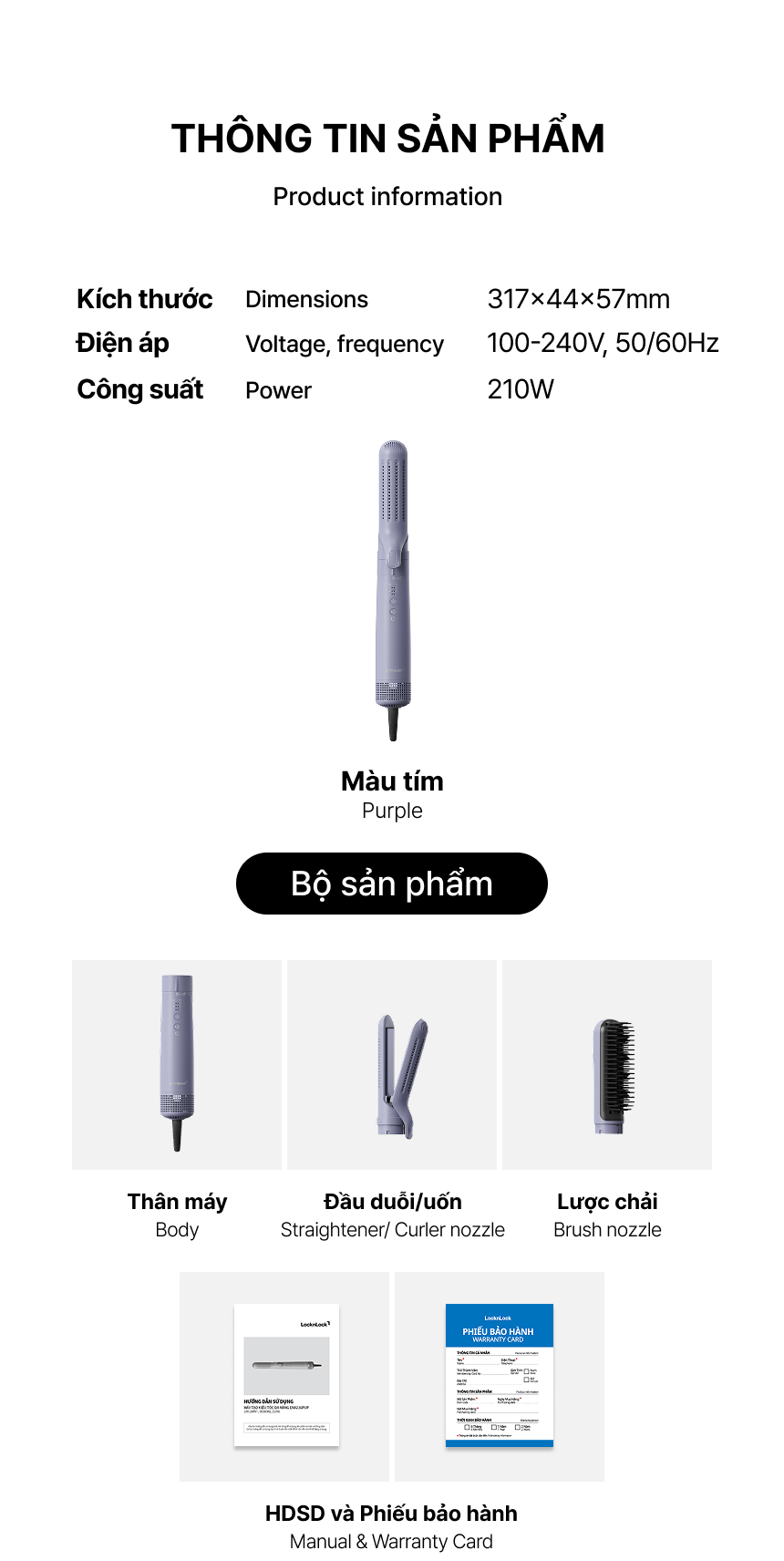 Máy tạo kiểu tóc đa năng 3 mức nhiệt linh hoạt LocknLock 210W - Màu tím - ENA236PUP - Hàng chính hãng