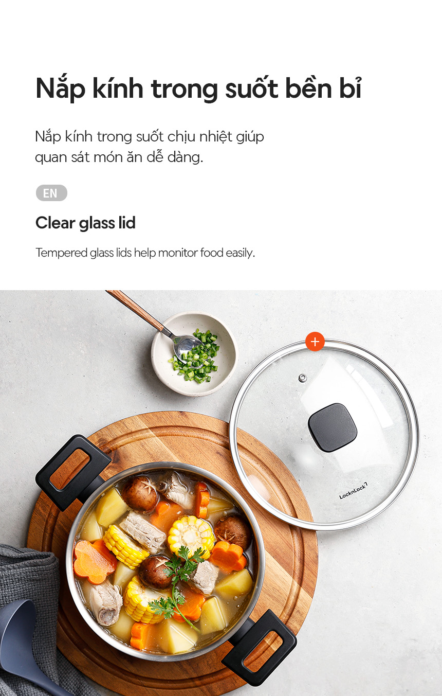 - TAY CẦM CHỊU NHIỆT, NẮP KÍNH TRONG SUỐT: Tay cầm stay-cool thoải mái khi sử dụng. Nắp kính trong suốt giúp quan sát món ăn dễ dàng