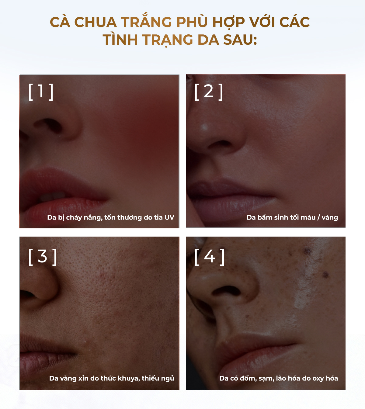 - Kết hợp 3 “thành phần vàng”: Cà chua trắng + Glutathione + Vitamin C hỗ trợ làm đều màu da, chống oxy hóa và hỗ trợ bảo vệ tế bào da khỏi tác hại từ ánh nắng.