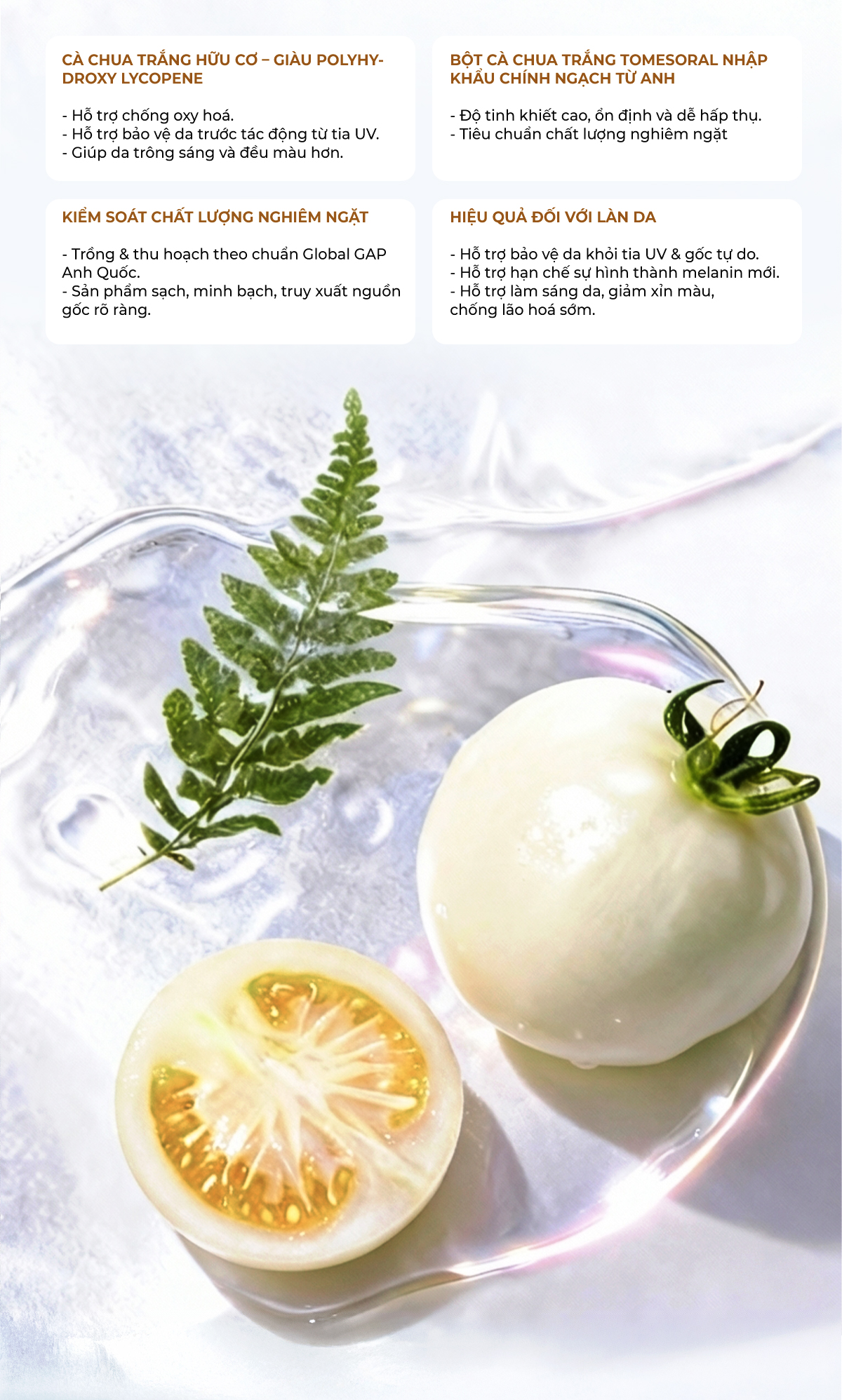 - Cà chua trắng là một thành phần làm đẹp hiếm và có giá trị cao, thường xuất hiện trong các sản phẩm dưỡng sáng da cao cấp