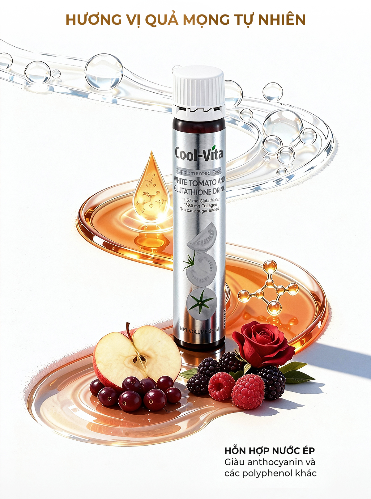 Thành phần: Nước tinh khiết, Chất tạo ngọt nhân tạo: Xylitol (7,62%), Hương liệu tổng hợp: Nước ép táo cô đặc, Hương liệu tổng hợp: Nước ép nam việt quất cô đặc, Hương liệu tổng hợp: Nước ép mâm xôi đỏ cô đặc, Bột cà chua trắng (0,57%), Hương liệu tổng hợp: Nước ép dâu tằm cô đặc, Hương liệu tổng hợp: Nước ép hoa hồng đỏ cánh kép cô đặc , Hương liệu tổng hợp: Quả mọng hỗn hợp, Acid L-Ascorbic (Vitamin C) (0,248%), collagen Peptide (cá) (0,23%), Chiết xuất nấm men [(NLT 5,5% glutathione)] (0,19%), Bột ô liu, Chất điều chỉnh độ acid: Acid DL-malic, Chất làm dày: Gôm Xanthan, Haematococcus pluvialis (chứa astaxanthin), Acid N-acetylneuraminic, Nicotinamid (Vitamin B3) (0,0015%).
