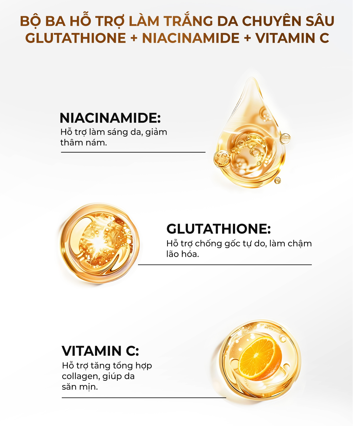 Thành phần chính: Cà chua trắng + Glutathione + Collagen Peptide + Vitamin C + Nicotinamid (Vitamin B3) hỗ trợ làm đều màu da, hỗ trợ chống oxy hóa, hỗ trợ bảo vệ da khỏi tác hại của tia UVA, UVB và ánh sáng xanh