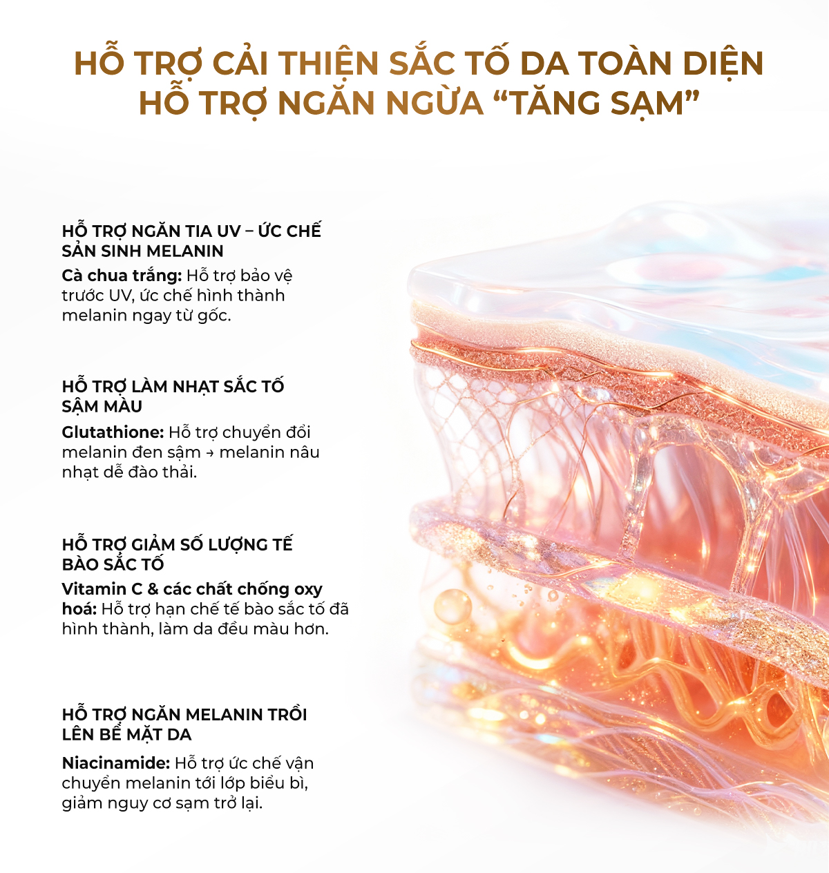- Bổ sung Collagen Peptide & Vitamin B3 hỗ trợ giúp da săn chắc, ẩm mịn và phục hồi độ đàn hồi da.