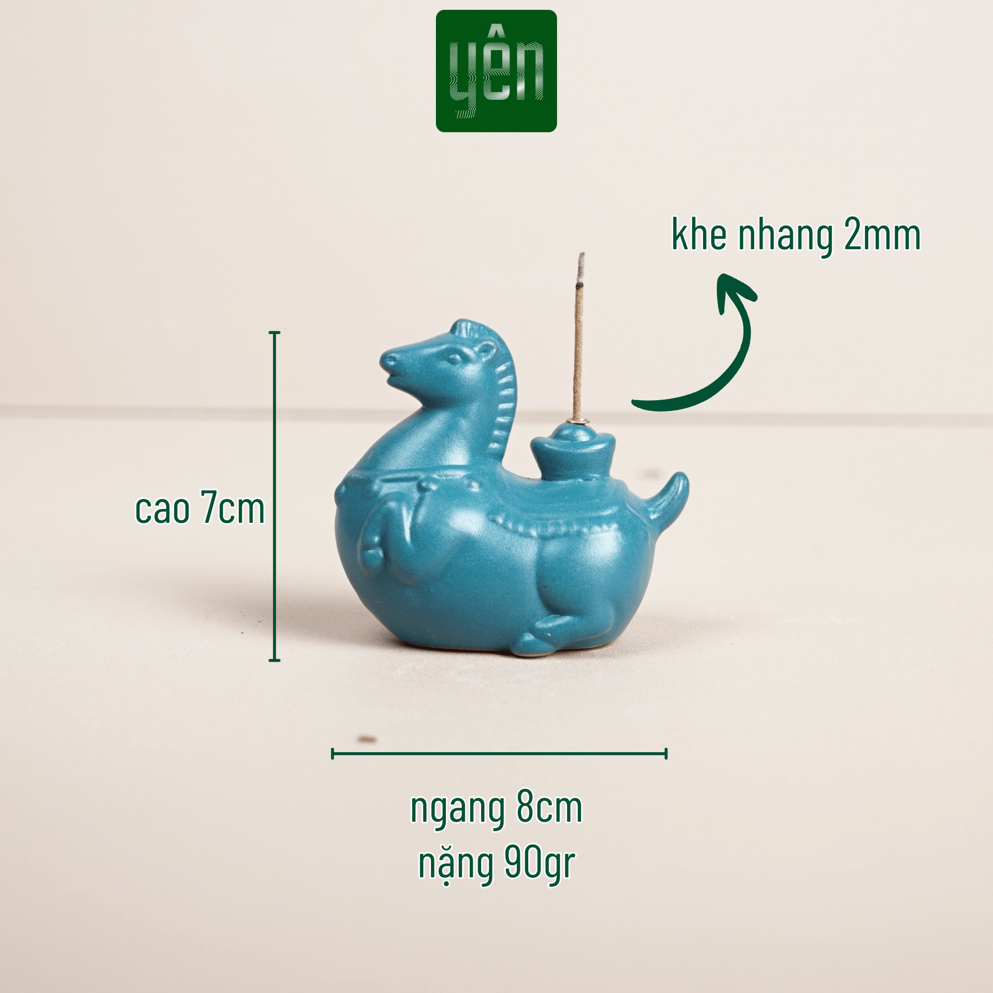 Kích thước: 8cm ngang x 7cm cao x cân nặng 90gr (tham khảo kích thước chi tiết trên hình sản phẩm). Khe cắm nhang 2mm (phù hợp với nhang không tăm, nhang trầm hương, nhang thảo mộc <30cm)