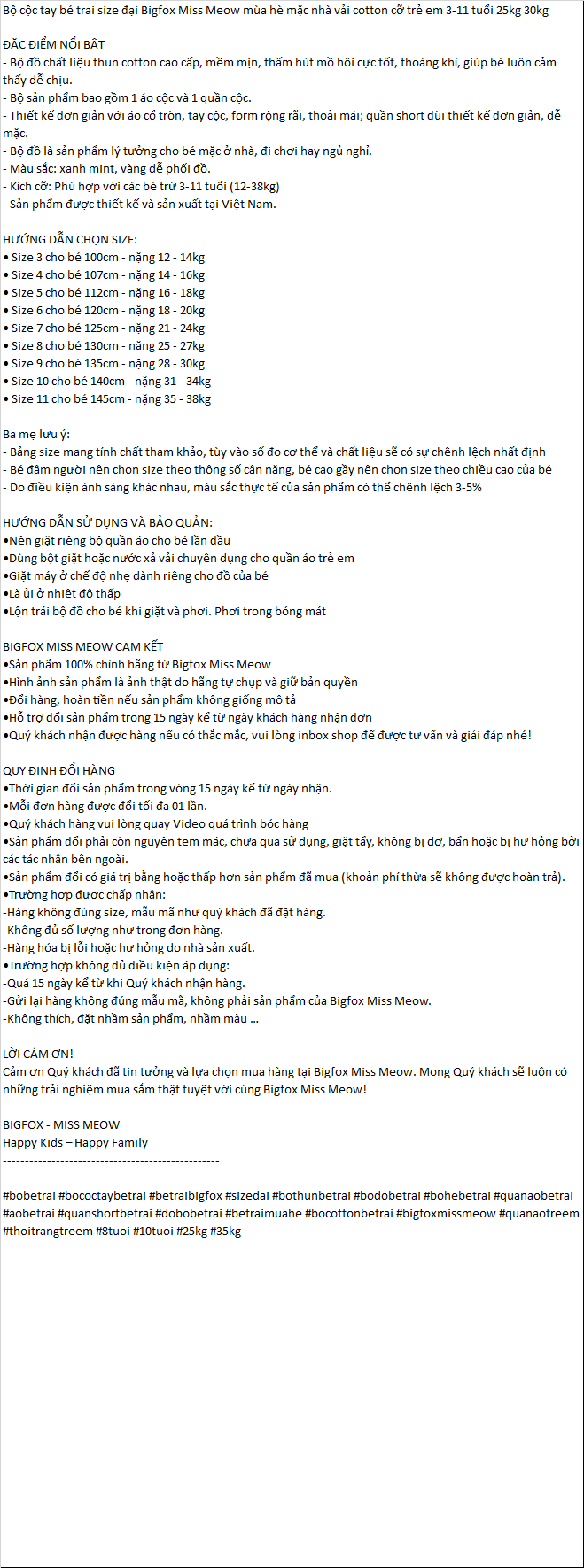 | Bộ cộc tay bé trai size đại Bigfox Miss Meow mùa hè mặc nhà vải cotton cỡ trẻ em 3-11 tuổi 25kg 30kg ĐẶC ĐIỂM NỔI BẬT - Bộ đồ chất liệu thun cotton cao cấp, mềm mịn, thấm hút mồ hôi cực tốt, thoáng khí, giúp bé luôn cảm thấy dễ chịu. - Bộ sản phẩm bao gồm 1 áo cộc và 1 quần cộc. - Thiết kế đơn giản với áo cổ tròn, tay cộc, form rộng rãi, thoải mái; quần short đùi thiết kế đơn giản, dễ mặc. - Bộ đồ là sản phẩm lý tưởng cho bé mặc ở nhà, đi chơi hay ngủ nghỉ. - Màu sắc: xanh mint, vàng dễ phối đồ. - Kích cỡ: Phù hợp với các bé trừ 3-11 tuổi (12-38kg) - Sản phẩm được thiết kế và sản xuất tại Việt Nam. HƯỚNG DẪN CHỌN SIZE: • Size 3 cho bé 100cm - nặng 12 - 14kg • Size 4 cho bé 107cm - nặng 14 - 16kg • Size 5 cho bé 112cm - nặng 16 - 18kg • Size 6 cho bé 120cm - nặng 18 - 20kg • Size 7 cho bé 125cm - nặng 21 - 24kg • Size 8 cho bé 130cm - nặng 25 - 27kg • Size 9 cho bé 135cm - nặng 28 - 30kg • Size 10 cho bé 140cm - nặng 31 - 34kg • Size 11 cho bé 145cm - nặng 35 - 38kg Ba mẹ lưu ý: - Bảng size mang tính chất tham khảo, tùy vào số đo cơ thể và chất liệu sẽ có sự chênh lệch nhất định - Bé đậm người nên chọn size theo thông số cân nặng, bé cao gầy nên chọn size theo chiều cao của bé - Do điều kiện ánh sáng khác nhau, màu sắc thực tế của sản phẩm có thể chênh lệch 3-5% HƯỚNG DẪN SỬ DỤNG VÀ BẢO QUẢN: • Nên giặt riêng bộ quần áo cho bé lần đầu • Dùng bột giặt hoặc nước xả vải chuyên dụng cho quần áo trẻ em • Giặt máy ở chế độ nhẹ dành riêng cho đồ của bé • Là ủi ở nhiệt độ thấp • Lộn trái bộ đồ cho bé khi giặt và phơi. Phơi trong bóng mát BIGFOX MISS MEOW CAM KẾT • Sản phẩm 100% chính hãng từ Bigfox Miss Meow • Hình ảnh sản phẩm là ảnh thật do hãng tự chụp và giữ bản quyền • Đổi hàng, hoàn tiền nếu sản phẩm không giống mô tả • Hỗ trợ đổi sản phẩm trong 15 ngày kể từ ngày khách hàng nhận đơn • Quý khách nhận được hàng nếu có thắc mắc, vui lòng inbox shop để được tư vấn và giải đáp nhé! QUY ĐỊNH ĐỔI HÀNG • Thời gian đổi sản phẩm trong vòng 15 ngày kể từ ngày nhận. • Mỗi đơn hàng được đổi tối đa 01 lần. • Quý khách hàng vui lòng quay Video quá trình bóc hàng • Sản phẩm đổi phải còn nguyên tem mác, chưa qua sử dụng, giặt tẩy, không bị dơ, bẩn hoặc bị hư hỏng bởi các tác nhân bên ngoài. • Sản phẩm đổi có giá trị bằng hoặc thấp hơn sản phẩm đã mua (khoản phí thừa sẽ không được hoàn trả). • Trường hợp được chấp nhận: - Hàng không đúng size, mẫu mã như quý khách đã đặt hàng. - Không đủ số lượng như trong đơn hàng. - Hàng hóa bị lỗi hoặc hư hỏng do nhà sản xuất. • Trường hợp không đủ điều kiện áp dụng: - Quá 15 ngày kể từ khi Quý khách nhận hàng. - Gửi lại hàng không đúng mẫu mã, không phải sản phẩm của Bigfox Miss Meow. - Không thích, đặt nhầm sản phẩm, nhầm màu … LỜI CẢM ƠN! Cảm ơn Quý khách đã tin tưởng và lựa chọn mua hàng tại Bigfox Miss Meow. Mong Quý khách sẽ luôn có những trải nghiệm mua sắm thật tuyệt vời cùng Bigfox Miss Meow! BIGFOX - MISS MEOW Happy Kids – Happy Family ------------------------------------------------- #bobetrai #bococtaybetrai #betraibigfox #sizedai #bothunbetrai #bodobetrai #bohebetrai #quanaobetrai #aobetrai #quanshortbetrai #dobobetrai #betraimuahe #bocottonbetrai #bigfoxmissmeow #quanaotreem #thoitrangtreem #8tuoi #10tuoi #25kg #35kg