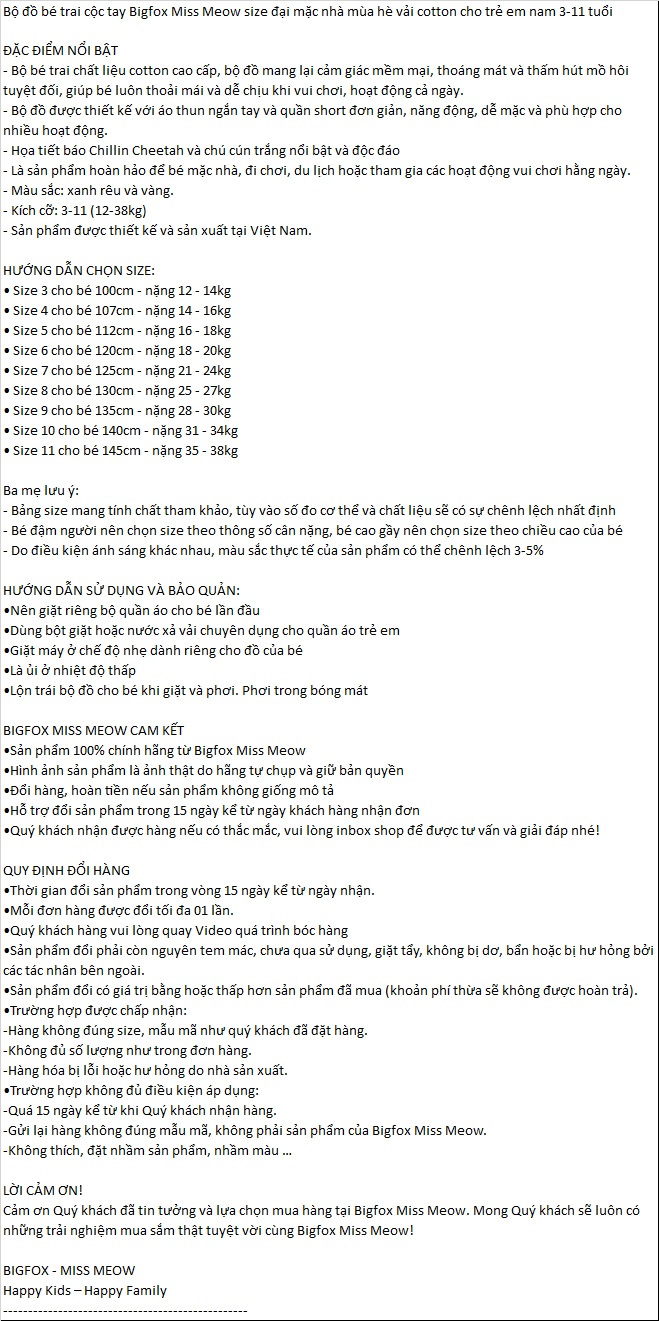 | Bộ đồ bé trai cộc tay Bigfox Miss Meow size đại mặc nhà mùa hè vải cotton cho trẻ em nam 3-11 tuổi ĐẶC ĐIỂM NỔI BẬT - Bộ bé trai chất liệu cotton cao cấp, bộ đồ mang lại cảm giác mềm mại, thoáng mát và thấm hút mồ hôi tuyệt đối, giúp bé luôn thoải mái và dễ chịu khi vui chơi, hoạt động cả ngày. - Bộ đồ được thiết kế với áo thun ngắn tay và quần short đơn giản, năng động, dễ mặc và phù hợp cho nhiều hoạt động. - Họa tiết báo Chillin Cheetah và chú cún trắng nổi bật và độc đáo - Là sản phẩm hoàn hảo để bé mặc nhà, đi chơi, du lịch hoặc tham gia các hoạt động vui chơi hằng ngày. - Màu sắc: xanh rêu và vàng. - Kích cỡ: 3-11 (12-38kg) - Sản phẩm được thiết kế và sản xuất tại Việt Nam. HƯỚNG DẪN CHỌN SIZE: • Size 3 cho bé 100cm - nặng 12 - 14kg • Size 4 cho bé 107cm - nặng 14 - 16kg • Size 5 cho bé 112cm - nặng 16 - 18kg • Size 6 cho bé 120cm - nặng 18 - 20kg • Size 7 cho bé 125cm - nặng 21 - 24kg • Size 8 cho bé 130cm - nặng 25 - 27kg • Size 9 cho bé 135cm - nặng 28 - 30kg • Size 10 cho bé 140cm - nặng 31 - 34kg • Size 11 cho bé 145cm - nặng 35 - 38kg Ba mẹ lưu ý: - Bảng size mang tính chất tham khảo, tùy vào số đo cơ thể và chất liệu sẽ có sự chênh lệch nhất định - Bé đậm người nên chọn size theo thông số cân nặng, bé cao gầy nên chọn size theo chiều cao của bé - Do điều kiện ánh sáng khác nhau, màu sắc thực tế của sản phẩm có thể chênh lệch 3-5% HƯỚNG DẪN SỬ DỤNG VÀ BẢO QUẢN: • Nên giặt riêng bộ quần áo cho bé lần đầu • Dùng bột giặt hoặc nước xả vải chuyên dụng cho quần áo trẻ em • Giặt máy ở chế độ nhẹ dành riêng cho đồ của bé • Là ủi ở nhiệt độ thấp • Lộn trái bộ đồ cho bé khi giặt và phơi. Phơi trong bóng mát BIGFOX MISS MEOW CAM KẾT • Sản phẩm 100% chính hãng từ Bigfox Miss Meow • Hình ảnh sản phẩm là ảnh thật do hãng tự chụp và giữ bản quyền • Đổi hàng, hoàn tiền nếu sản phẩm không giống mô tả • Hỗ trợ đổi sản phẩm trong 15 ngày kể từ ngày khách hàng nhận đơn • Quý khách nhận được hàng nếu có thắc mắc, vui lòng inbox shop để được tư vấn và giải đáp nhé! QUY ĐỊNH ĐỔI HÀNG • Thời gian đổi sản phẩm trong vòng 15 ngày kể từ ngày nhận. • Mỗi đơn hàng được đổi tối đa 01 lần. • Quý khách hàng vui lòng quay Video quá trình bóc hàng • Sản phẩm đổi phải còn nguyên tem mác, chưa qua sử dụng, giặt tẩy, không bị dơ, bẩn hoặc bị hư hỏng bởi các tác nhân bên ngoài. • Sản phẩm đổi có giá trị bằng hoặc thấp hơn sản phẩm đã mua (khoản phí thừa sẽ không được hoàn trả). • Trường hợp được chấp nhận: - Hàng không đúng size, mẫu mã như quý khách đã đặt hàng. - Không đủ số lượng như trong đơn hàng. - Hàng hóa bị lỗi hoặc hư hỏng do nhà sản xuất. • Trường hợp không đủ điều kiện áp dụng: - Quá 15 ngày kể từ khi Quý khách nhận hàng. - Gửi lại hàng không đúng mẫu mã, không phải sản phẩm của Bigfox Miss Meow. - Không thích, đặt nhầm sản phẩm, nhầm màu … LỜI CẢM ƠN! Cảm ơn Quý khách đã tin tưởng và lựa chọn mua hàng tại Bigfox Miss Meow. Mong Quý khách sẽ luôn có những trải nghiệm mua sắm thật tuyệt vời cùng Bigfox Miss Meow! BIGFOX - MISS MEOW Happy Kids – Happy Family ------------------------------------------------- #bobetrai #bococtaybetrai #betraibigfox #sizedai #bothunbetrai #bodobetrai #bohebetrai #quanaobetrai #aobetrai #quanshortbetrai #dobobetrai #betraimuahe #bocottonbetrai #bigfoxmissmeow #quanaotreem #thoitrangtreem #8tuoi #10tuoi #25kg #35kg