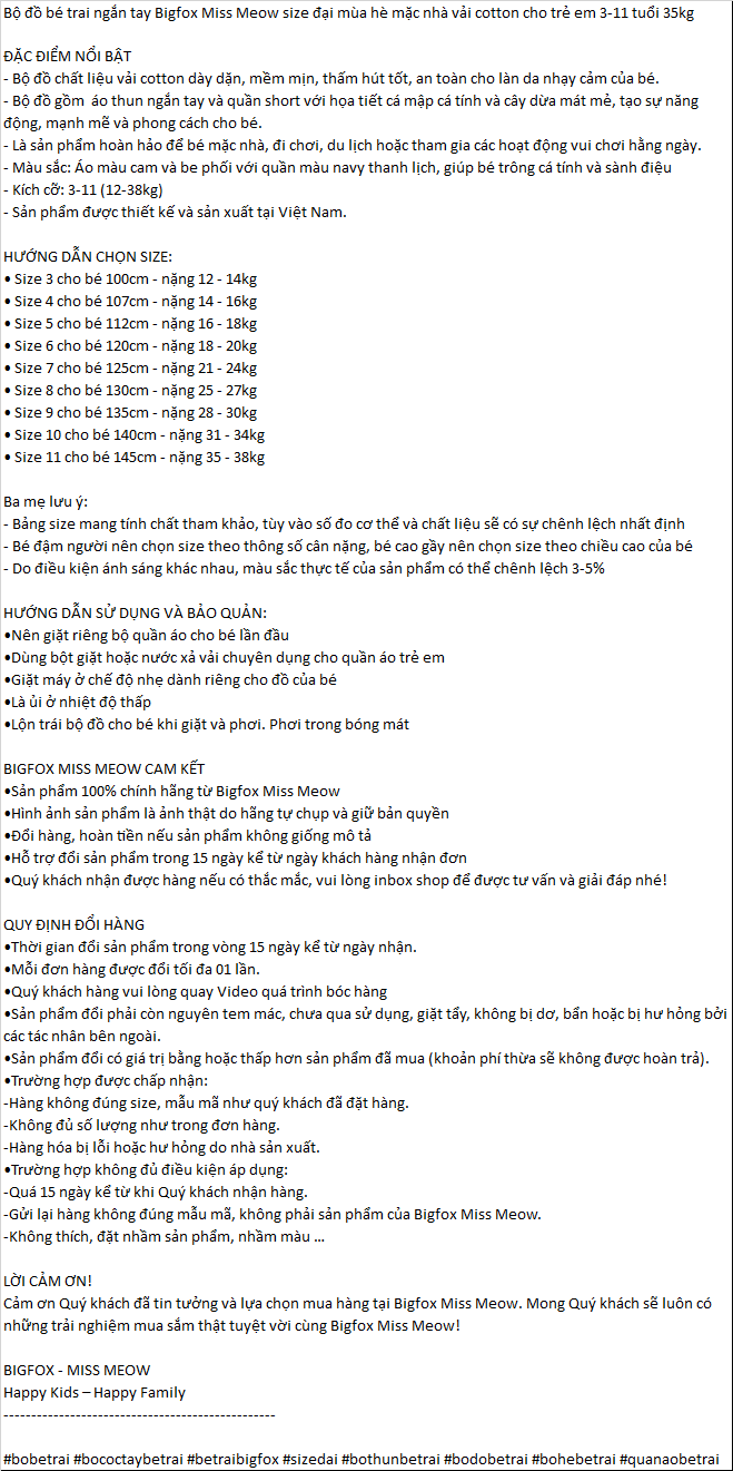| Bộ đồ bé trai ngắn tay Bigfox Miss Meow size đại mùa hè mặc nhà vải cotton cho trẻ em 3-11 tuổi 35kg ĐẶC ĐIỂM NỔI BẬT - Bộ đồ chất liệu vải cotton dày dặn, mềm mịn, thấm hút tốt, an toàn cho làn da nhạy cảm của bé. - Bộ đồ gồm áo thun ngắn tay và quần short với họa tiết cá mập cá tính và cây dừa mát mẻ, tạo sự năng động, mạnh mẽ và phong cách cho bé. - Là sản phẩm hoàn hảo để bé mặc nhà, đi chơi, du lịch hoặc tham gia các hoạt động vui chơi hằng ngày. - Màu sắc: Áo màu cam và be phối với quần màu navy thanh lịch, giúp bé trông cá tính và sành điệu - Kích cỡ: 3-11 (12-38kg) - Sản phẩm được thiết kế và sản xuất tại Việt Nam. HƯỚNG DẪN CHỌN SIZE: • Size 3 cho bé 100cm - nặng 12 - 14kg • Size 4 cho bé 107cm - nặng 14 - 16kg • Size 5 cho bé 112cm - nặng 16 - 18kg • Size 6 cho bé 120cm - nặng 18 - 20kg • Size 7 cho bé 125cm - nặng 21 - 24kg • Size 8 cho bé 130cm - nặng 25 - 27kg • Size 9 cho bé 135cm - nặng 28 - 30kg • Size 10 cho bé 140cm - nặng 31 - 34kg • Size 11 cho bé 145cm - nặng 35 - 38kg Ba mẹ lưu ý: - Bảng size mang tính chất tham khảo, tùy vào số đo cơ thể và chất liệu sẽ có sự chênh lệch nhất định - Bé đậm người nên chọn size theo thông số cân nặng, bé cao gầy nên chọn size theo chiều cao của bé - Do điều kiện ánh sáng khác nhau, màu sắc thực tế của sản phẩm có thể chênh lệch 3-5% HƯỚNG DẪN SỬ DỤNG VÀ BẢO QUẢN: • Nên giặt riêng bộ quần áo cho bé lần đầu • Dùng bột giặt hoặc nước xả vải chuyên dụng cho quần áo trẻ em • Giặt máy ở chế độ nhẹ dành riêng cho đồ của bé • Là ủi ở nhiệt độ thấp • Lộn trái bộ đồ cho bé khi giặt và phơi. Phơi trong bóng mát BIGFOX MISS MEOW CAM KẾT • Sản phẩm 100% chính hãng từ Bigfox Miss Meow • Hình ảnh sản phẩm là ảnh thật do hãng tự chụp và giữ bản quyền • Đổi hàng, hoàn tiền nếu sản phẩm không giống mô tả • Hỗ trợ đổi sản phẩm trong 15 ngày kể từ ngày khách hàng nhận đơn • Quý khách nhận được hàng nếu có thắc mắc, vui lòng inbox shop để được tư vấn và giải đáp nhé! QUY ĐỊNH ĐỔI HÀNG • Thời gian đổi sản phẩm trong vòng 15 ngày kể từ ngày nhận. • Mỗi đơn hàng được đổi tối đa 01 lần. • Quý khách hàng vui lòng quay Video quá trình bóc hàng • Sản phẩm đổi phải còn nguyên tem mác, chưa qua sử dụng, giặt tẩy, không bị dơ, bẩn hoặc bị hư hỏng bởi các tác nhân bên ngoài. • Sản phẩm đổi có giá trị bằng hoặc thấp hơn sản phẩm đã mua (khoản phí thừa sẽ không được hoàn trả). • Trường hợp được chấp nhận: - Hàng không đúng size, mẫu mã như quý khách đã đặt hàng. - Không đủ số lượng như trong đơn hàng. - Hàng hóa bị lỗi hoặc hư hỏng do nhà sản xuất. • Trường hợp không đủ điều kiện áp dụng: - Quá 15 ngày kể từ khi Quý khách nhận hàng. - Gửi lại hàng không đúng mẫu mã, không phải sản phẩm của Bigfox Miss Meow. - Không thích, đặt nhầm sản phẩm, nhầm màu … LỜI CẢM ƠN! Cảm ơn Quý khách đã tin tưởng và lựa chọn mua hàng tại Bigfox Miss Meow. Mong Quý khách sẽ luôn có những trải nghiệm mua sắm thật tuyệt vời cùng Bigfox Miss Meow! BIGFOX - MISS MEOW Happy Kids – Happy Family ------------------------------------------------- #bobetrai #bococtaybetrai #betraibigfox #sizedai #bothunbetrai #bodobetrai #bohebetrai #quanaobetrai #aobetrai #quanshortbetrai #dobobetrai #betraimuahe #bocottonbetrai #bigfoxmissmeow #quanaotreem #thoitrangtreem #8tuoi #10tuoi #25kg #35kg