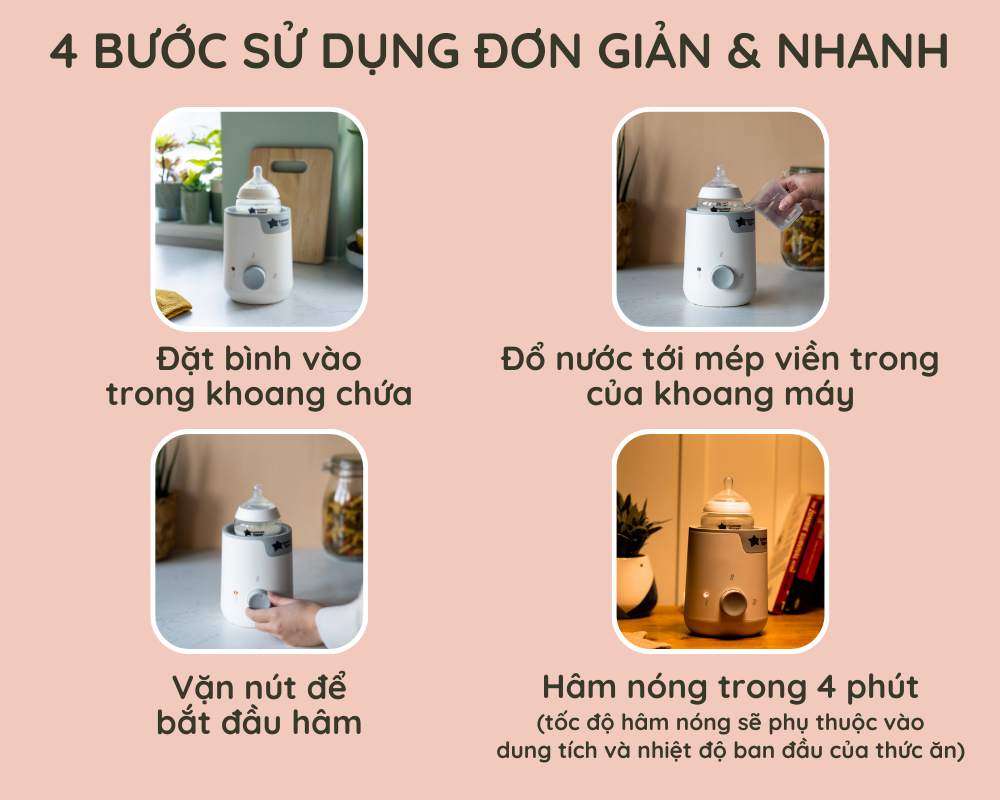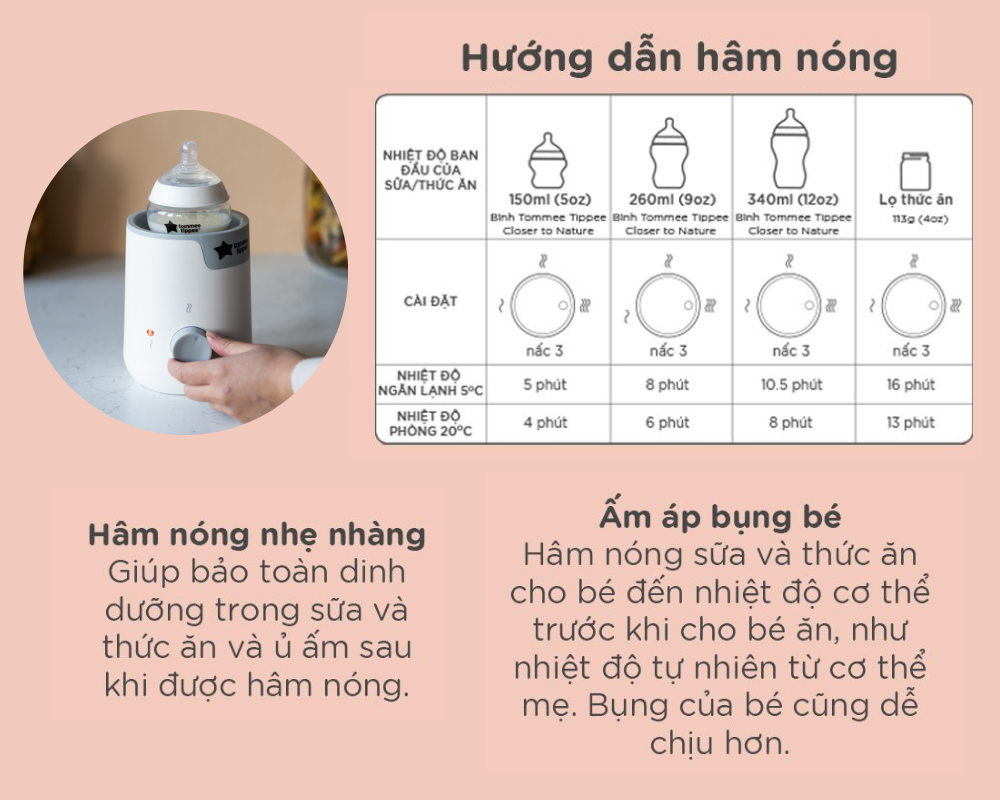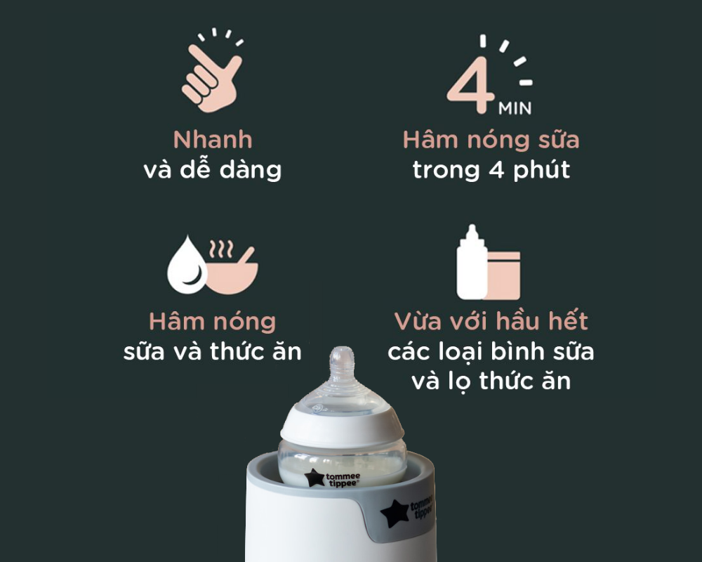 - Hâm nóng nhanh: Làm nóng sữa mẹ, sữa công thức và thức ăn tới nhiệt độ cơ thể nhanh chóng. Thời gian hâm nóng phụ thuộc vào dung tích và nhiệt độ ban đầu của sữa/thức ăn. Thời gian hâm nóng 4 phút thực hiện cho bình sữa 150ml ở nhiệt độ phòng (20oC).