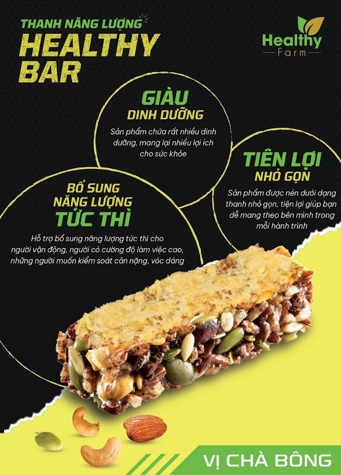 Thanh năng lượng Healthy Bar là thực phẩm bổ sung năng lượng tức thì cho những người vận động cao, người có cường độ làm việc cao không có thời gian ăn uống hay những người muốn kiểm soát cân nặng, vóc dáng.