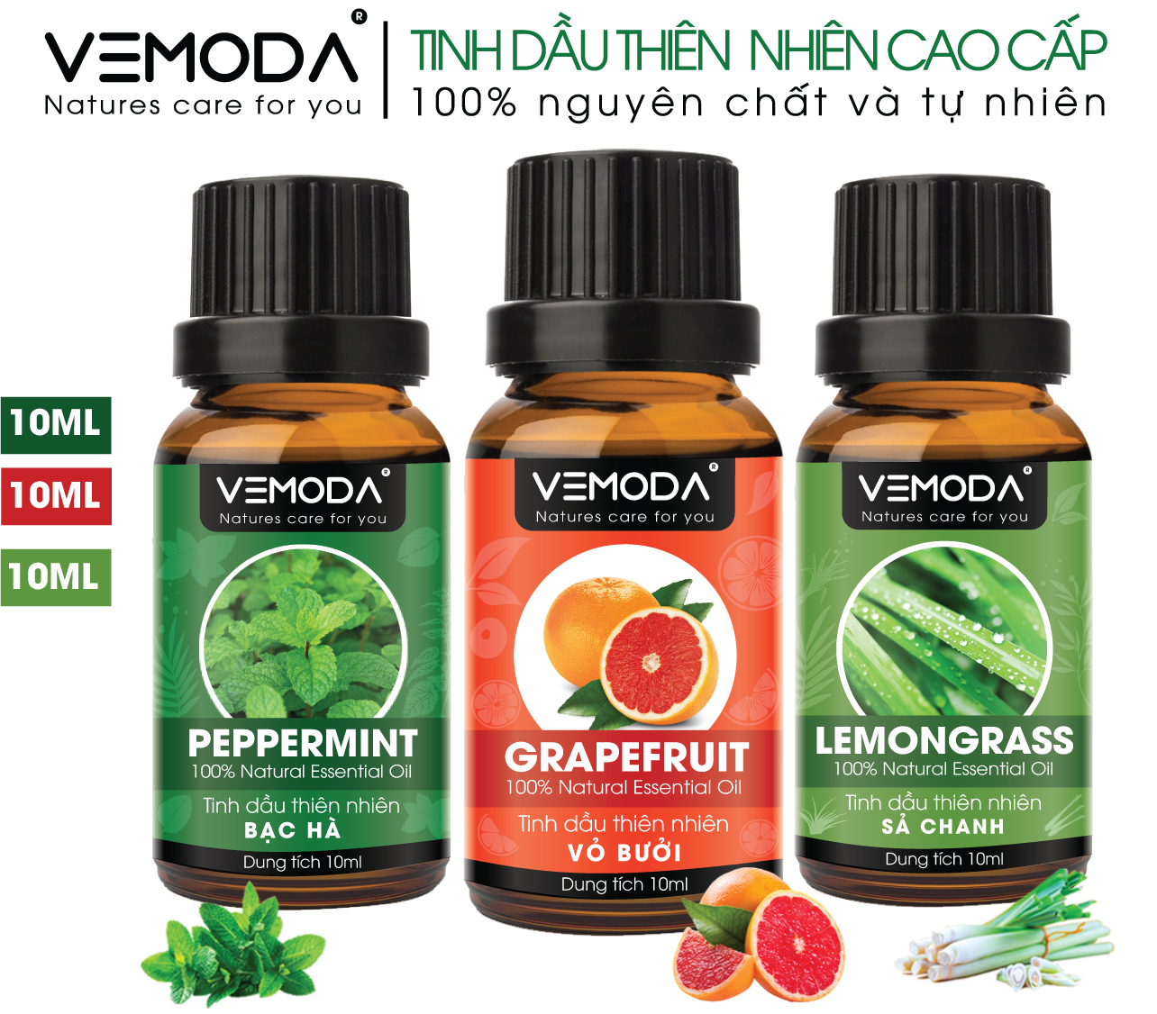 Tinh dầu xông phòng cao cấp gồm 3 chai tinh dầu nguyên chất Vemoda: tinh dầu Sả chanh (10ml) + tinh dầu Vỏ bưởi HG (10ml) + tinh dầu Bạc hà (10ml)