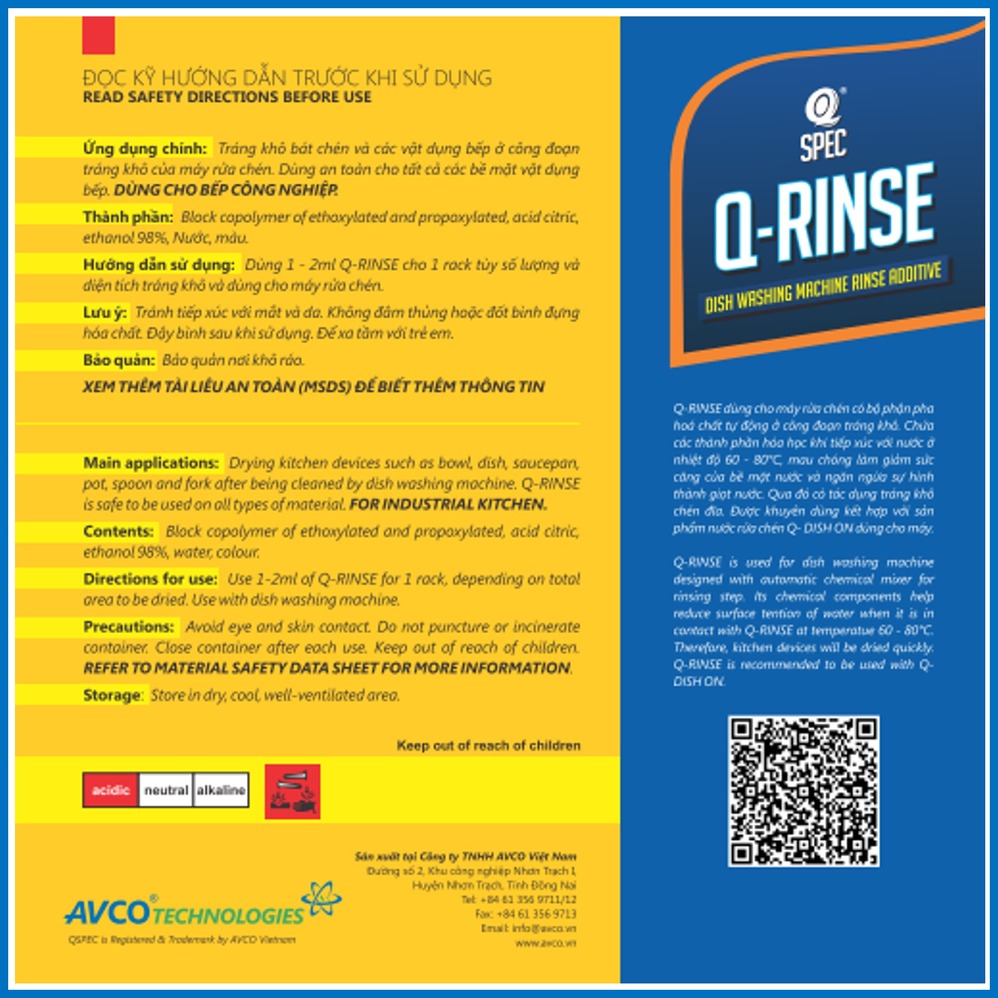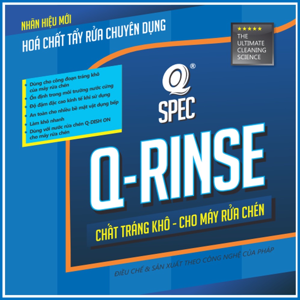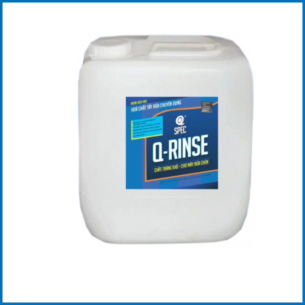 Q-RINSE dùng cho máy rửa chén có bộ phận pha hoá chất tự động ở công đoạn tráng khô. Chứa các thành phần hóa học khi tiếp xúc với nước ở nhiệt độ 60 - 80°C, mau chóng làm giảm độ căng của bề mặt nước và ngăn ngừa sự hình thành giọt nước. Qua đó có tác dụng tráng khô chén đĩa. Được khuyên dùng kết hợp với sản phẩm nước rửa chén Q-DISH ON dùng cho máy.