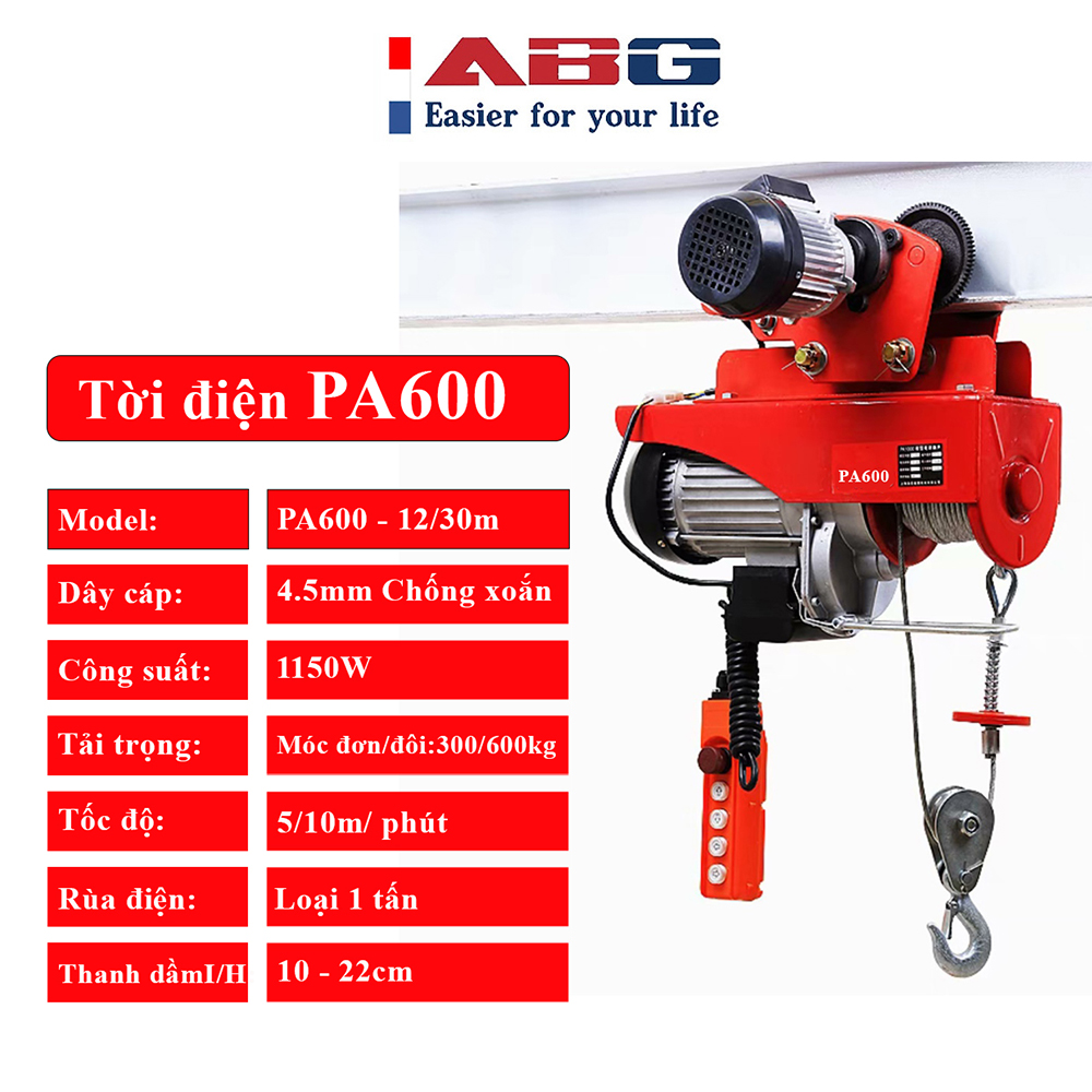 Bộ Tời Điện Kèm Rùa ABG PA600 (300/600Kg) 12 Mét - Máy Tời Treo Nâng Hạ Vật Nặng Dễ Dàng Trong Nhà Xưởng Công Nghiệp Và Đời Sống, Nâng Kéo Linh Hoạt, Hiệu Quả Cao - Hàng Chính Hãng