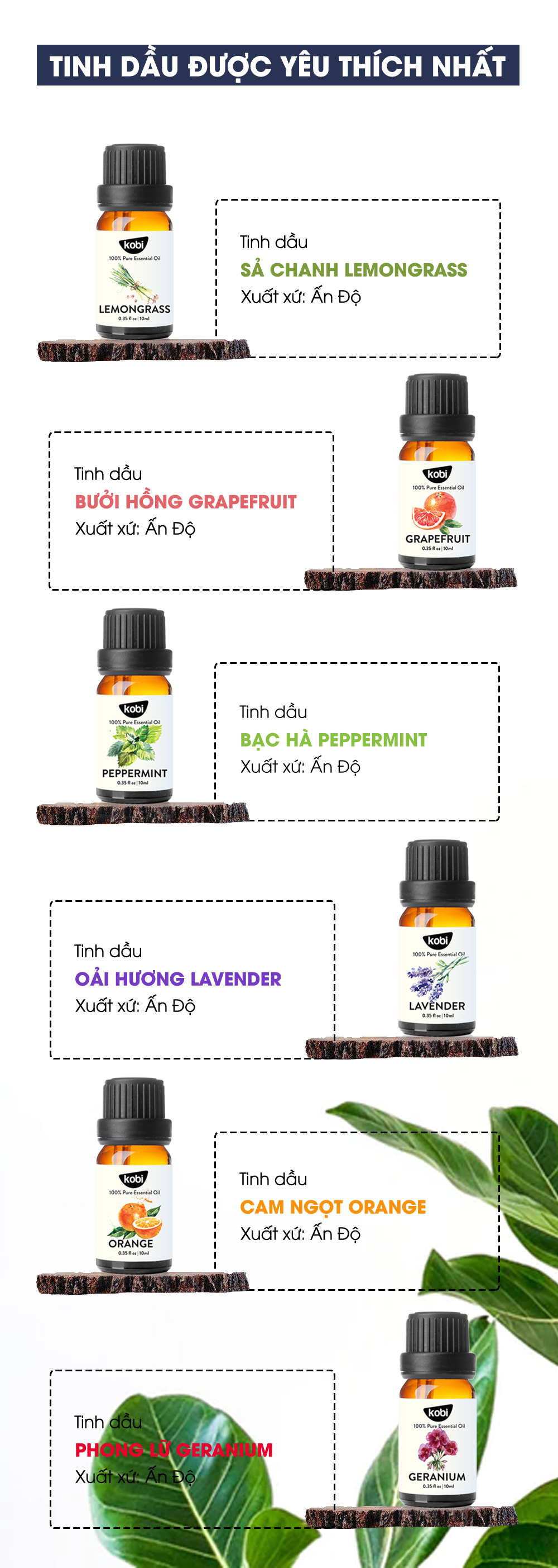 | Thành phần | 100% tinh dầu thiên nhiên, nguyên chất. |