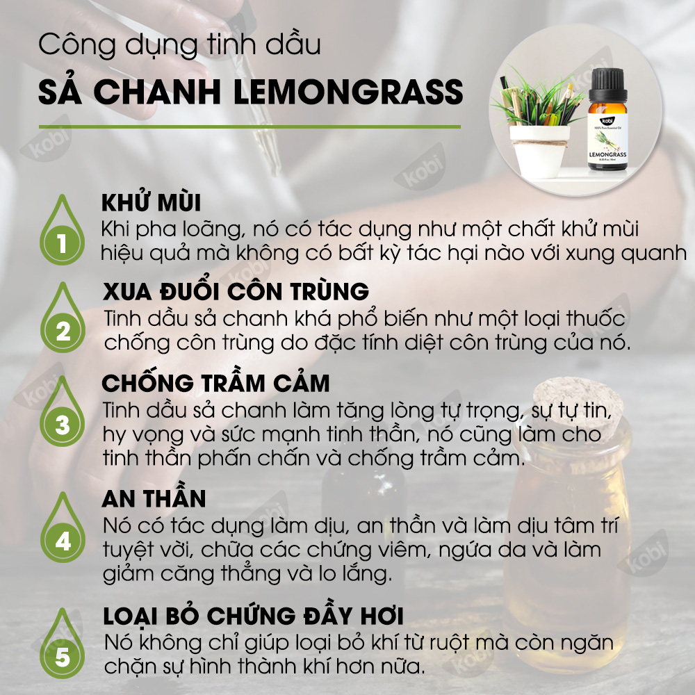 Combo 3 Tinh Dầu Xông Phòng Kháng Khuẩn Sả Chanh, Cam Ngọt, Oải Hương Kobi Giúp Khử Trùng, Thanh Lọc Không Khí, Khử Mùi, Đuổi Muỗi Nguyên Chất (30ml/Lọ): Bộ sản phẩm sẽ giúp cho không gian nhà bạn thêm sảng khoái hơn, bởi hương thơm từ 3 loại tinh dầu giúp thư giãn tinh thần và relax rất hiệu quả. Được chiết xuất từ thiên nhiên combo tinh dầu khử trùng diệt khuẩn giúp kháng virus, vi khuẩn, tăng hệ miễn dịch cho cơ thể và phòng ngừa nhiều dịch bệnh nguy hiểm.