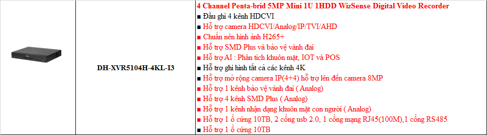 | DH-XVR5104H-4KL-I3 | 4 Channel Penta-brid 5MP Mini 1U 1HDD WizSense Digital Video Recorder ■ Đầu ghi 4 kênh HDCVI ■ Hỗ trợ camera HDCVI/Analog/IP/TVI/AHD ■ Chuẩn nén hình ảnh H265+ ■ Hỗ trợ SMD Plus và bảo vệ vành đai ■ Hỗ trợ AI : Phân tích khuôn mặt, IOT và POS ■ Hỗ trợ ghi hình tất cả các kênh 4K ■ Hỗ trợ mở rộng camera IP(4+4) hỗ trợ lên đến camera 8MP ■ Hỗ trợ 1 kênh bảo vệ vành đai ( Analog) ■ Hỗ trợ 4 kênh SMD Plus ( Analog) ■ Hỗ trợ 1 kênh nhận dạng khuôn mặt con người ( Analog) ■ Hỗ trợ 1 ổ cứng 10TB, 2 cổng usb 2.0, 1 cổng mạng RJ45(100M),1 cổng RS485 ■ Hỗ trợ 1 ổ cứng 10TB ■ Nguồn DC12V/2A ■ Chất liệu vỏ sắt