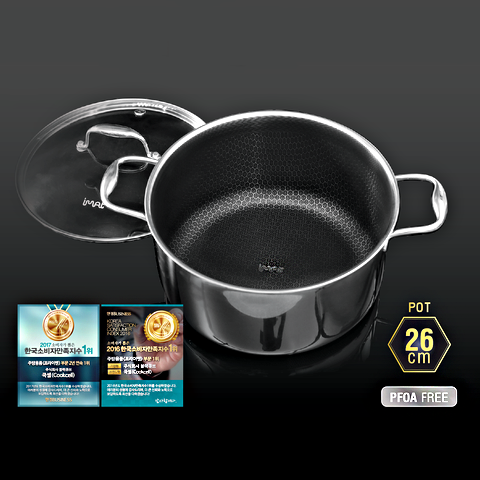 Vung nồi bằng thuỷ tinh chịu nhiệt, trong suốt nên dễ quan sát thực phẩm trong khi nấu. Logo iMat in sắc nét trên vung và đáy nồi.