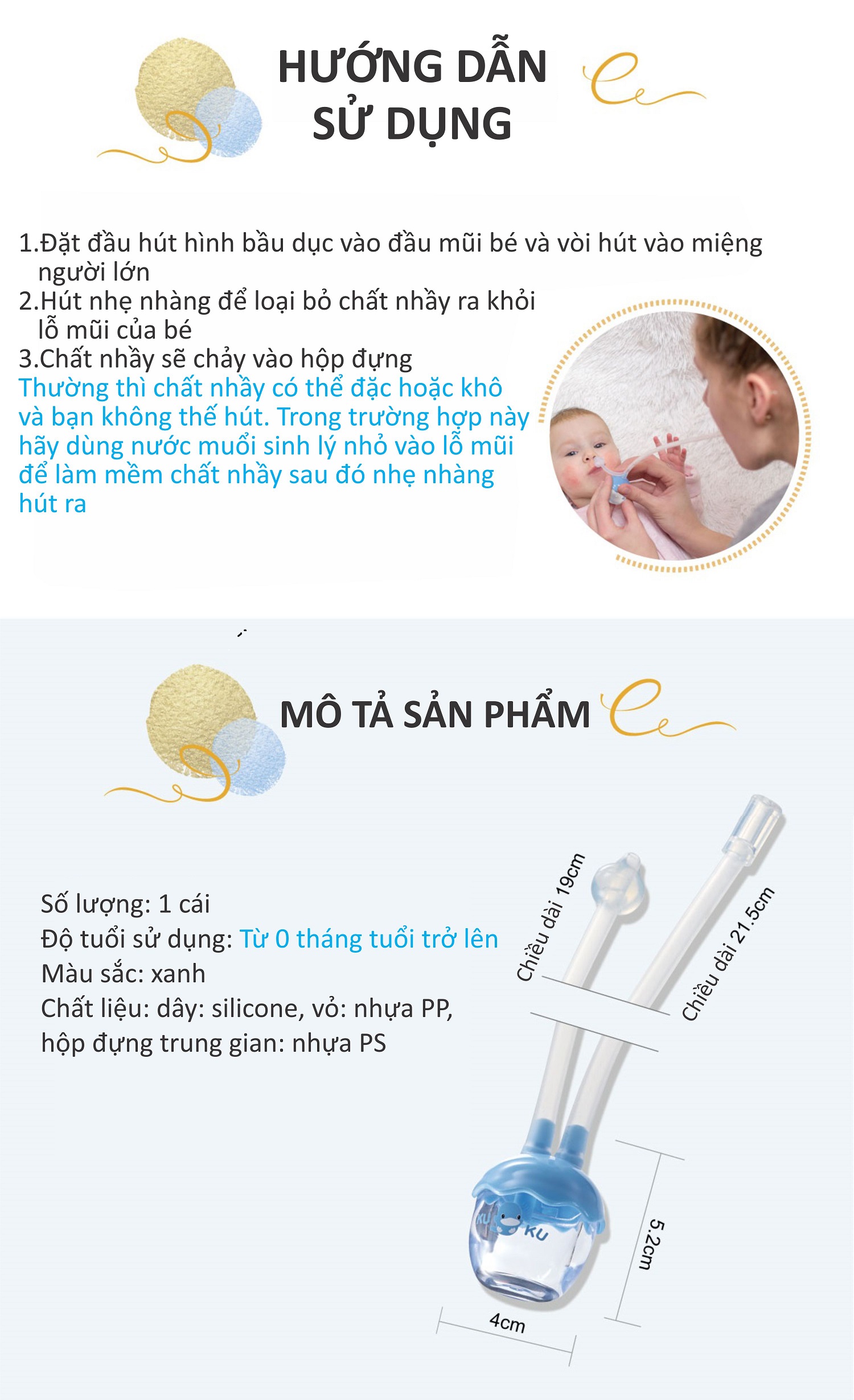 HDSD: đặt đầu dây tròn vào mũi bé một cách nhẹ nhàng, đầu kia hút nhẹ để loại bỏ tiết mũi từ lỗ mũi của bé.Tiết mũi sẽ chảy vào cốc.