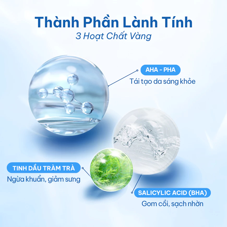 - Ngoài BHA & Tea Tree Oil, dòng này còn bổ sung thêm 3 hoạt chất AHAs (Lactic Acid, Glycolic Acid, Malic Acid) và PHA tăng cường cấp ẩm, loại bỏ tế bào chết bề mặt, cải thiện kết cấu và tông da, cho da sáng, láng mịn, mờ thâm, căng bóng, se khít lỗ chân lông và chống oxy hóa