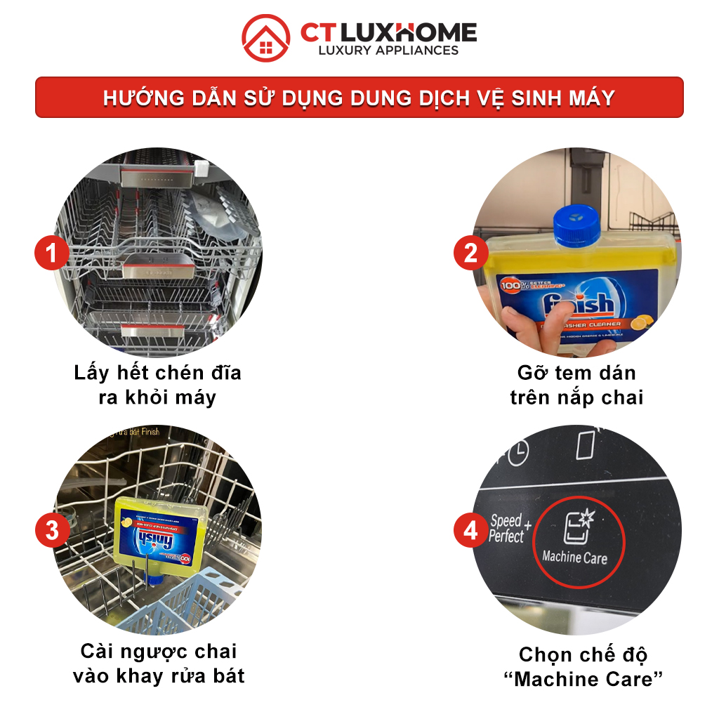 - Sử dụng dung dịch vệ sinh máy rửa bát Finish 250ml giúp làm sạch sâu các vết bẩn, đánh bay hoàn toàn các chất vôi và dầu mỡ bám bên trong máy.