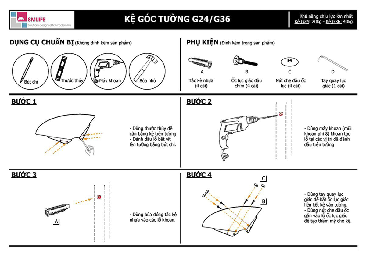 | Quy cách đóng gói | 1 Kệ góc 24 và ốc vít đi kèm |