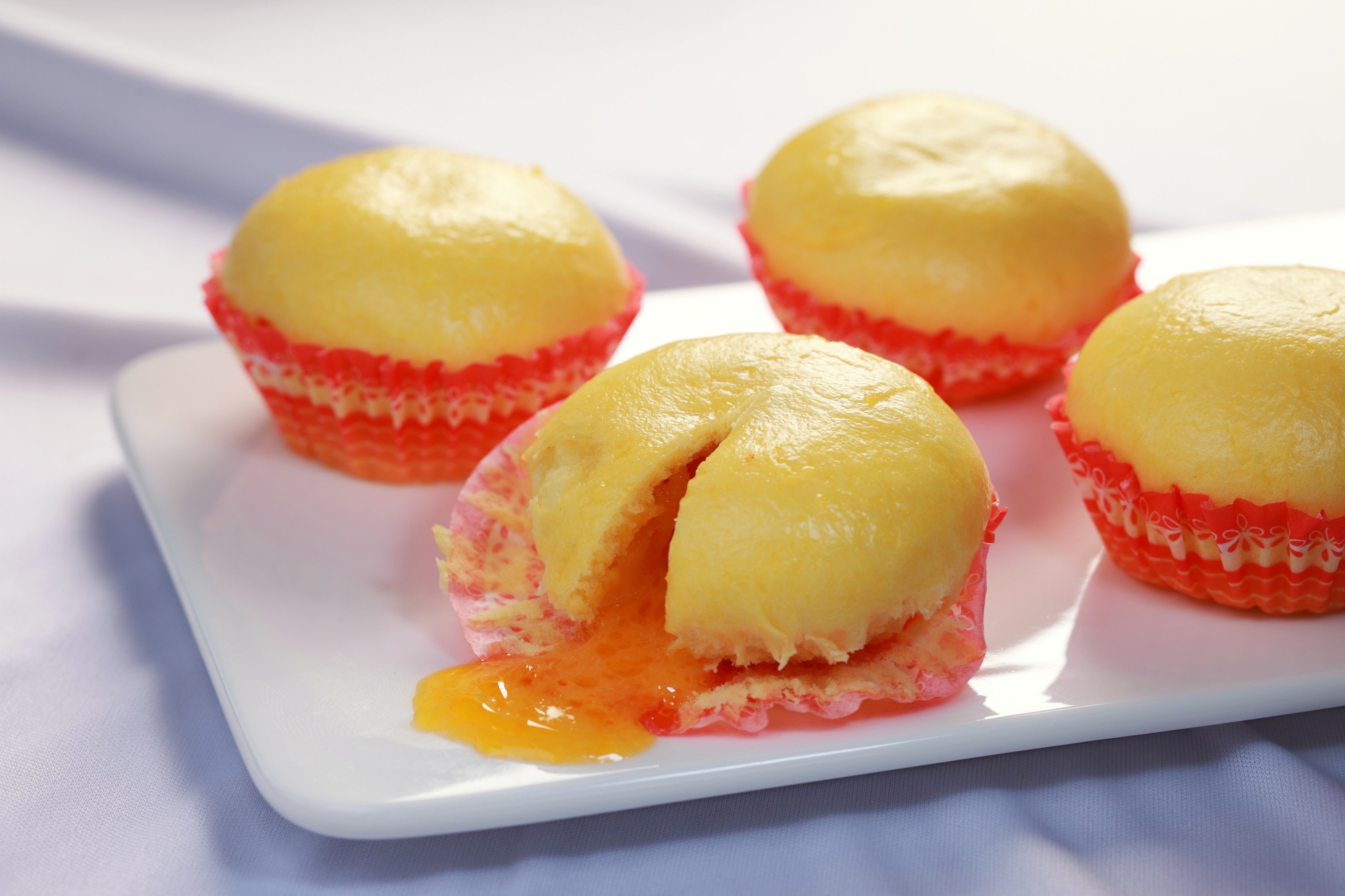 MÔ TẢ SẢN PHẨM: Bánh bao có vỏ màu vàng, giấy lót màu đỏ, nhân màu vàng. Vỏ bánh mềm xốp, nhân tan chảy thơm mùi trứng sữa, vị béo đặc trưng của trứng muối gây cảm giác khó cưỡng cho người dùng