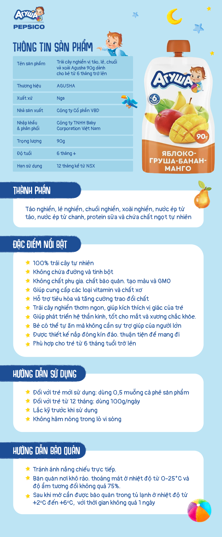 Giới thiệu Trái cây nghiền vị táo, lê, chuối và xoài Agusha 90g dành cho bé từ 6 tháng trở lên