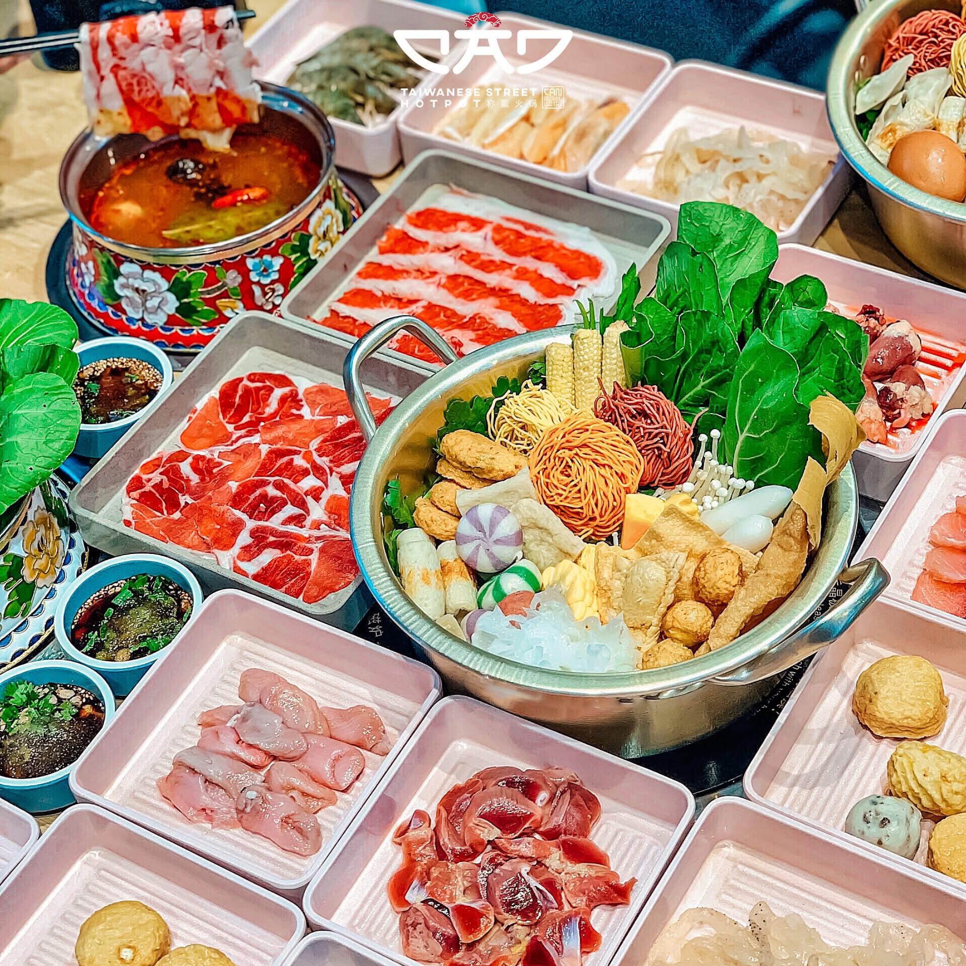 - Các món nhúng chính: Ba chỉ bò, Gầu bò, Gầu hoa bò, Bắp bò cay tứ xuyên, Tôm, Vẹm, Bạch Tuộc, Cá hồi filet, Sò điệp, Đùi ếch, Mực, Cá viên Tobiko, Tôm hùm viên, Đậu hũ phomai,