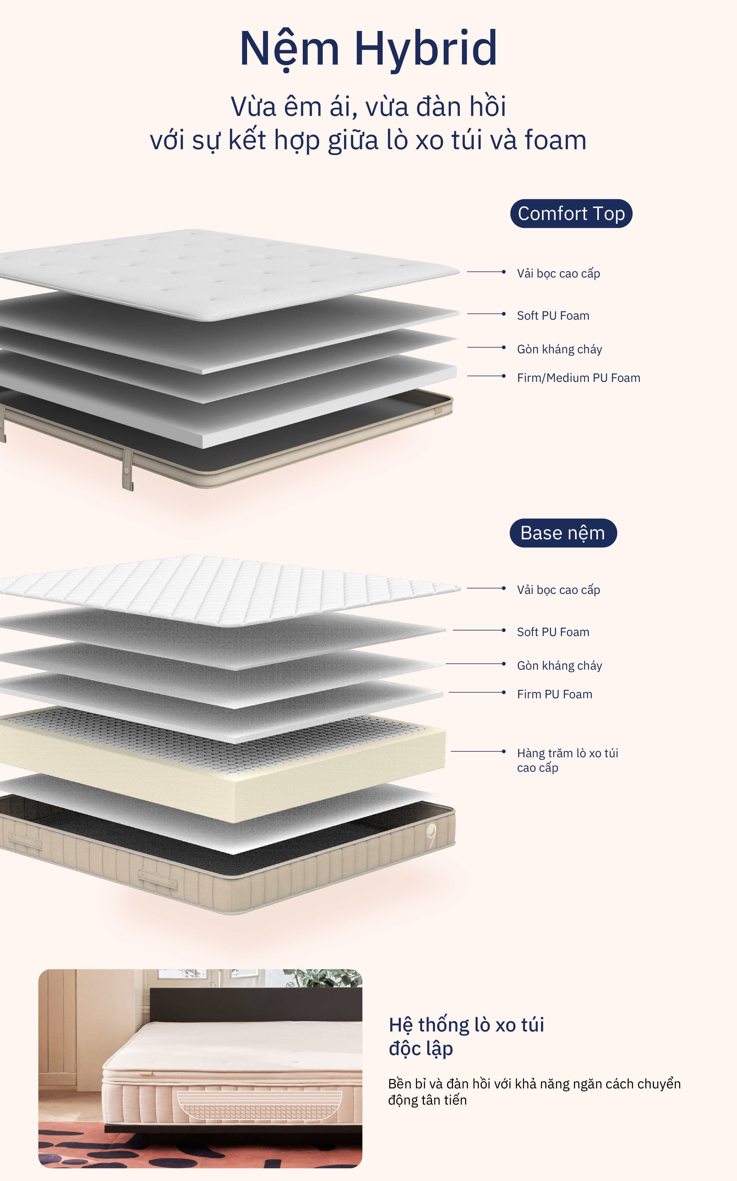 - Sản phẩm bao gồm: 1 Comfort Top (Medium/ Firm), 1 Hybrid Base Lò xo